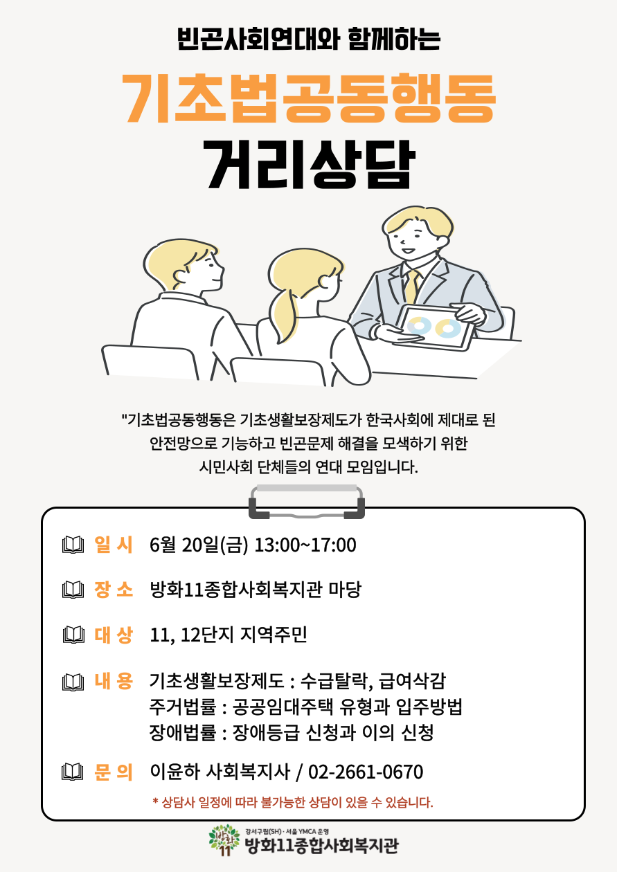 지난 6월 20일(금), 많은 비가 내리던 오후 1시 방화11종합사회복지관은 빈곤사회연대와 함께하는 ‘기초법공동행동 거리 상담’을 진행했습니다.
