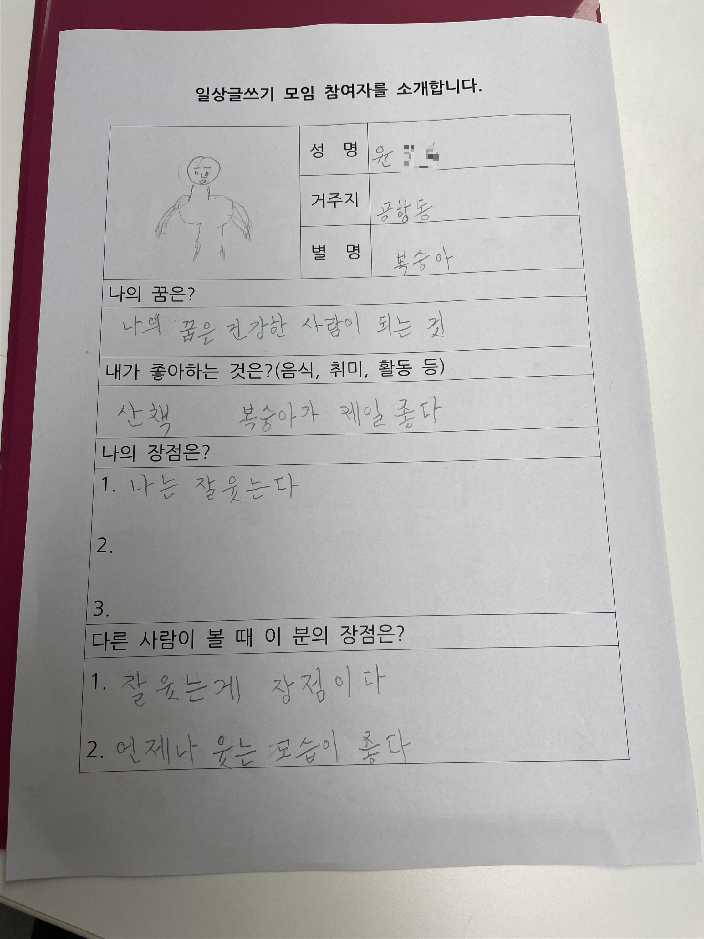 이번 모임은 참여 어르신들의 자기소개 글을 다시 한 번 써봤습니다. 이미 한 번 경험해보신 내용이라 이번에는 좀 더 편안하고 자연스럽게, 나를 표현하는 글을 잘 써내려가실 수 있을 것 같았습니다.