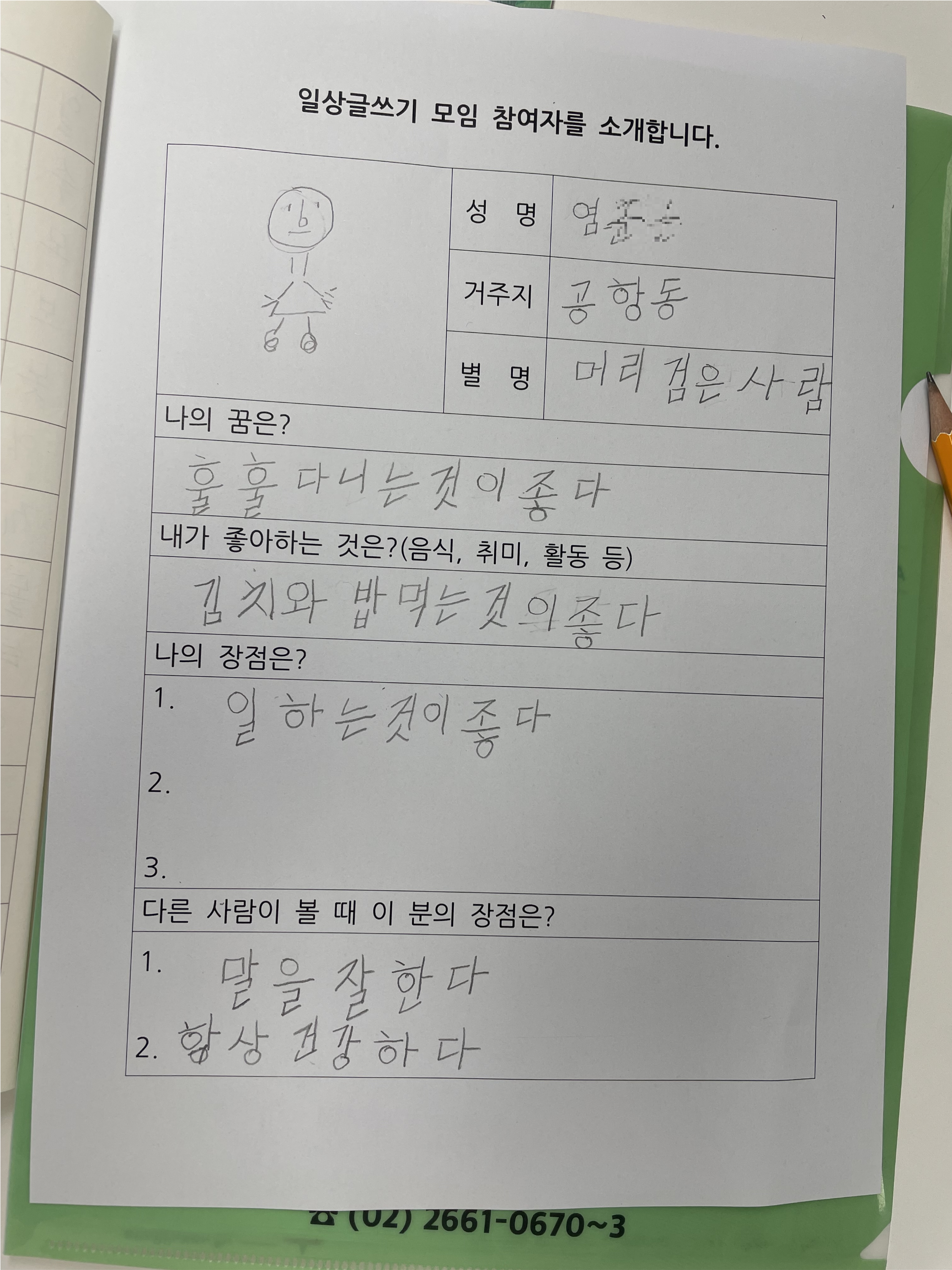 이번 모임은 참여 어르신들의 자기소개 글을 다시 한 번 써봤습니다. 이미 한 번 경험해보신 내용이라 이번에는 좀 더 편안하고 자연스럽게, 나를 표현하는 글을 잘 써내려가실 수 있을 것 같았습니다.