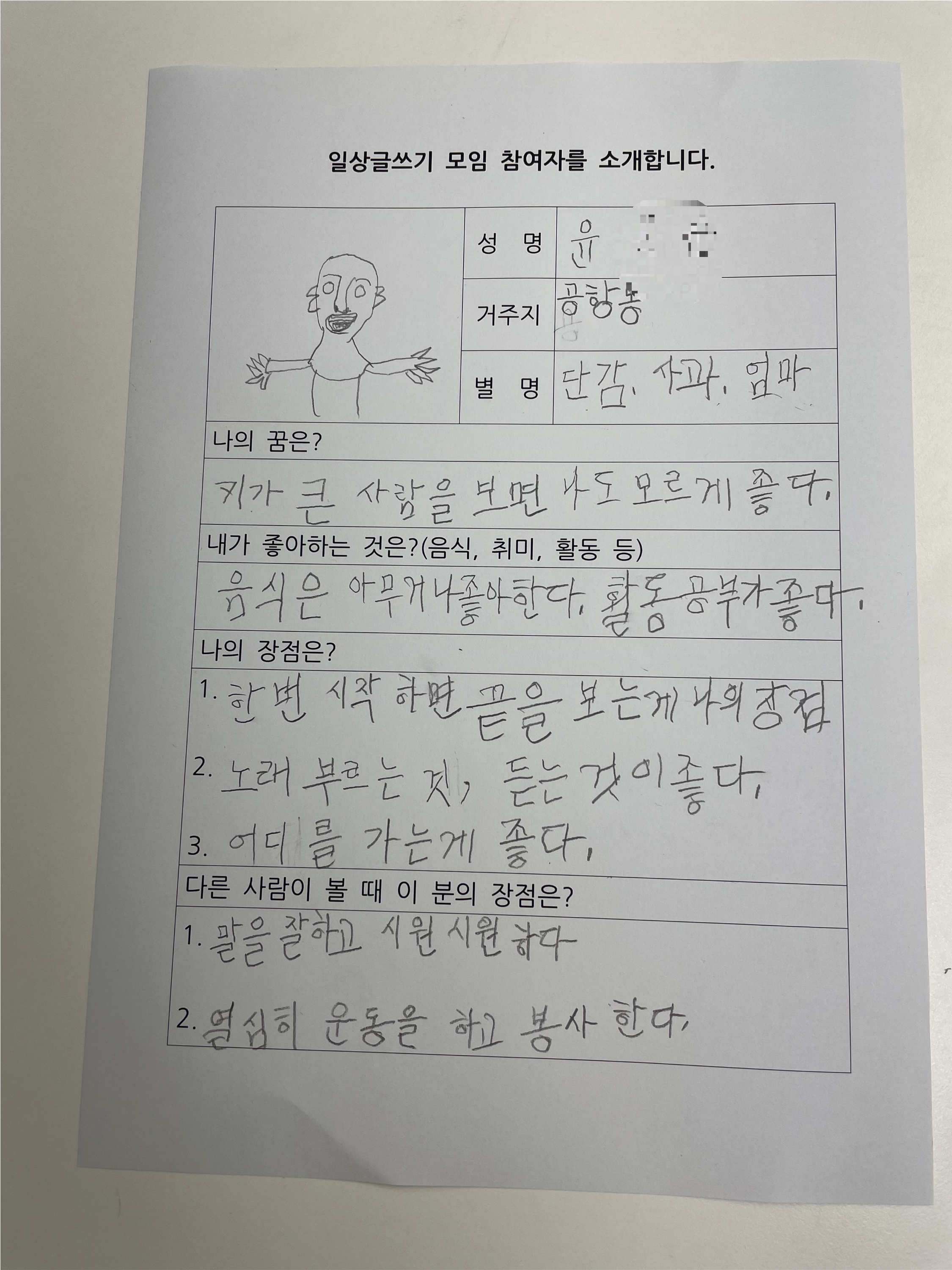 염00 어르신은 “나는 그런 줄 몰랐는데 그렇게 봐줘서 고맙다” 하며 쑥스러워하시기도 했고, 서로 칭찬을 주고받으며 자연스럽게 웃음도 많이 나왔습니다. 그렇게 자기소개 글을 통해 서로를 조금 더 깊이 이해하고, 관계가 한층 가까워지는 걸 느낄 수 있었습니다.