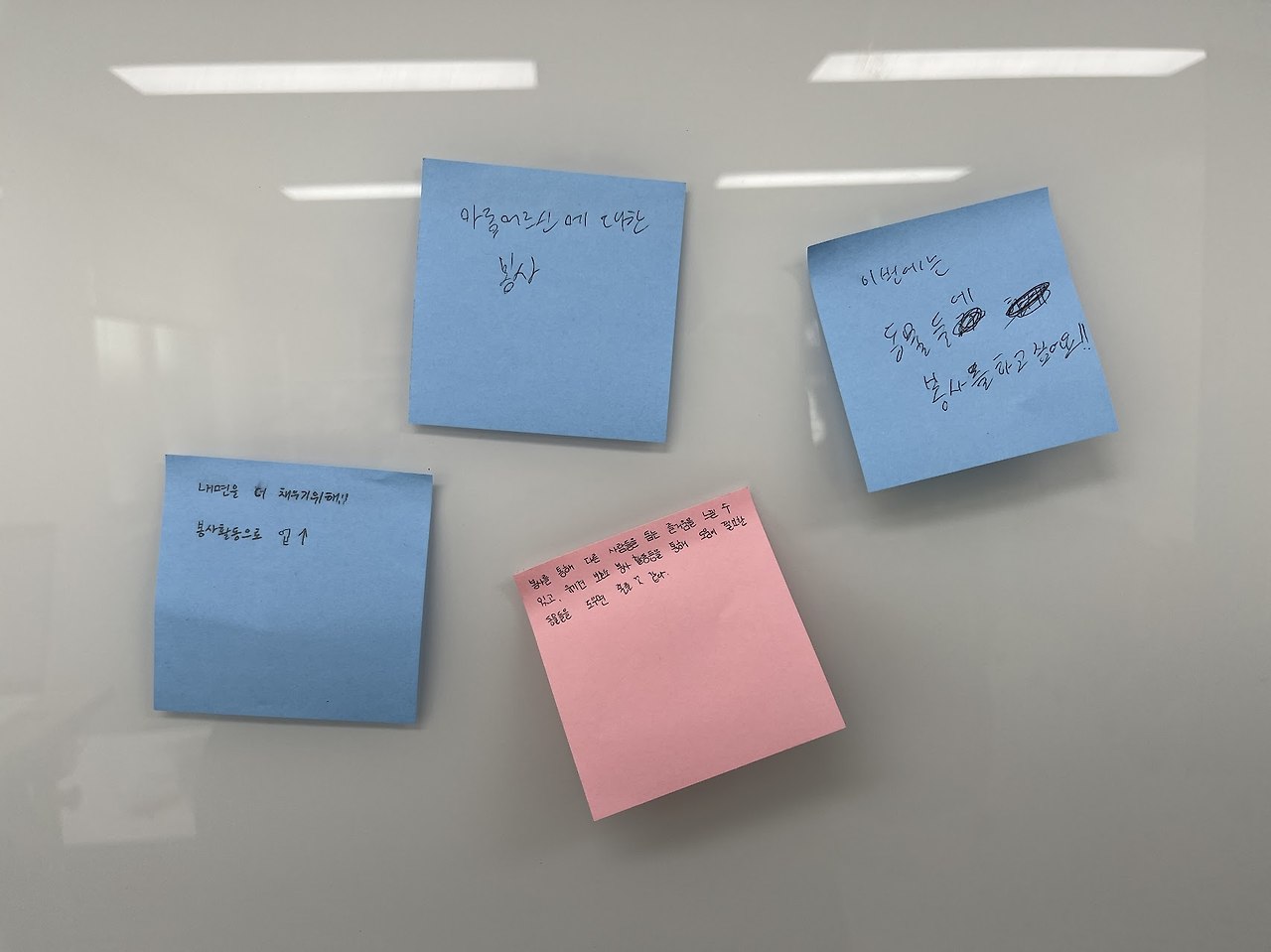 플로깅, 도시락 전달, 학습지도, 유기견 보호소 봉사 등 구체적인 아이디어가 모였습니다.