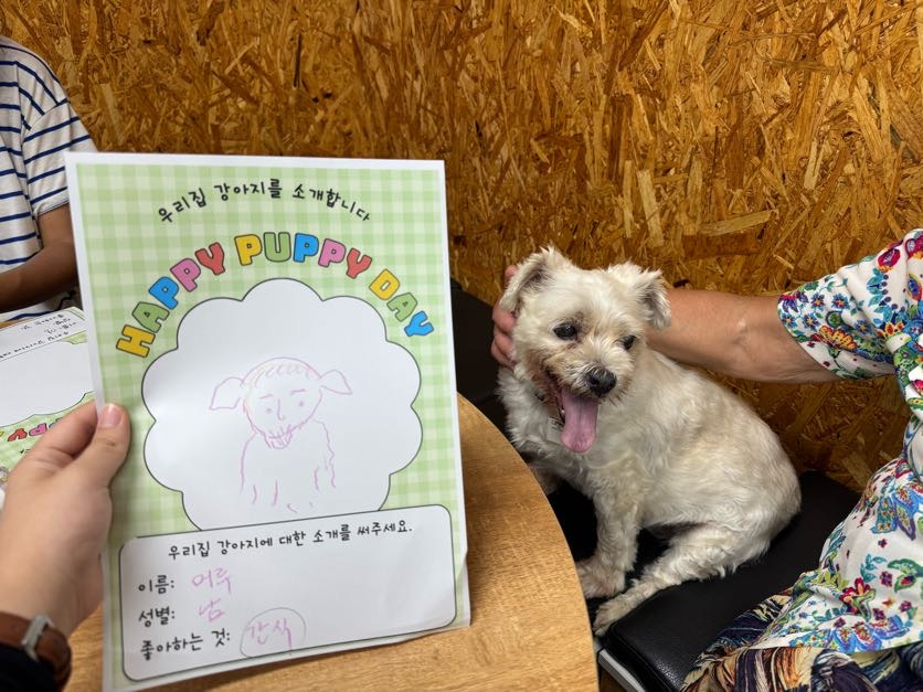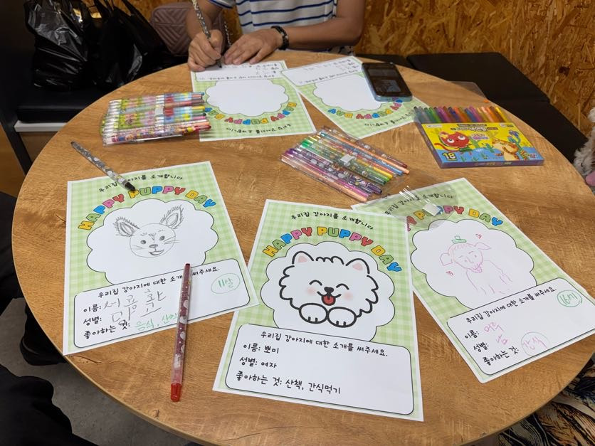 색연필을 고르고, 반려견을 바라보며 반려견 소개지를 완성해 나가는 시간이 정말 즐거웠습니다. 어떤 분은 강아지를 사람처럼 그리기도 하고, 또 어떤 분은 귀여운 캐릭터처럼 표현하기도 했어요. 서로의 그림을 보며 웃음이 끊이지 않았고, 다양한 반려견 그림 덕분에 더 풍성한 시간이 되었습니다.