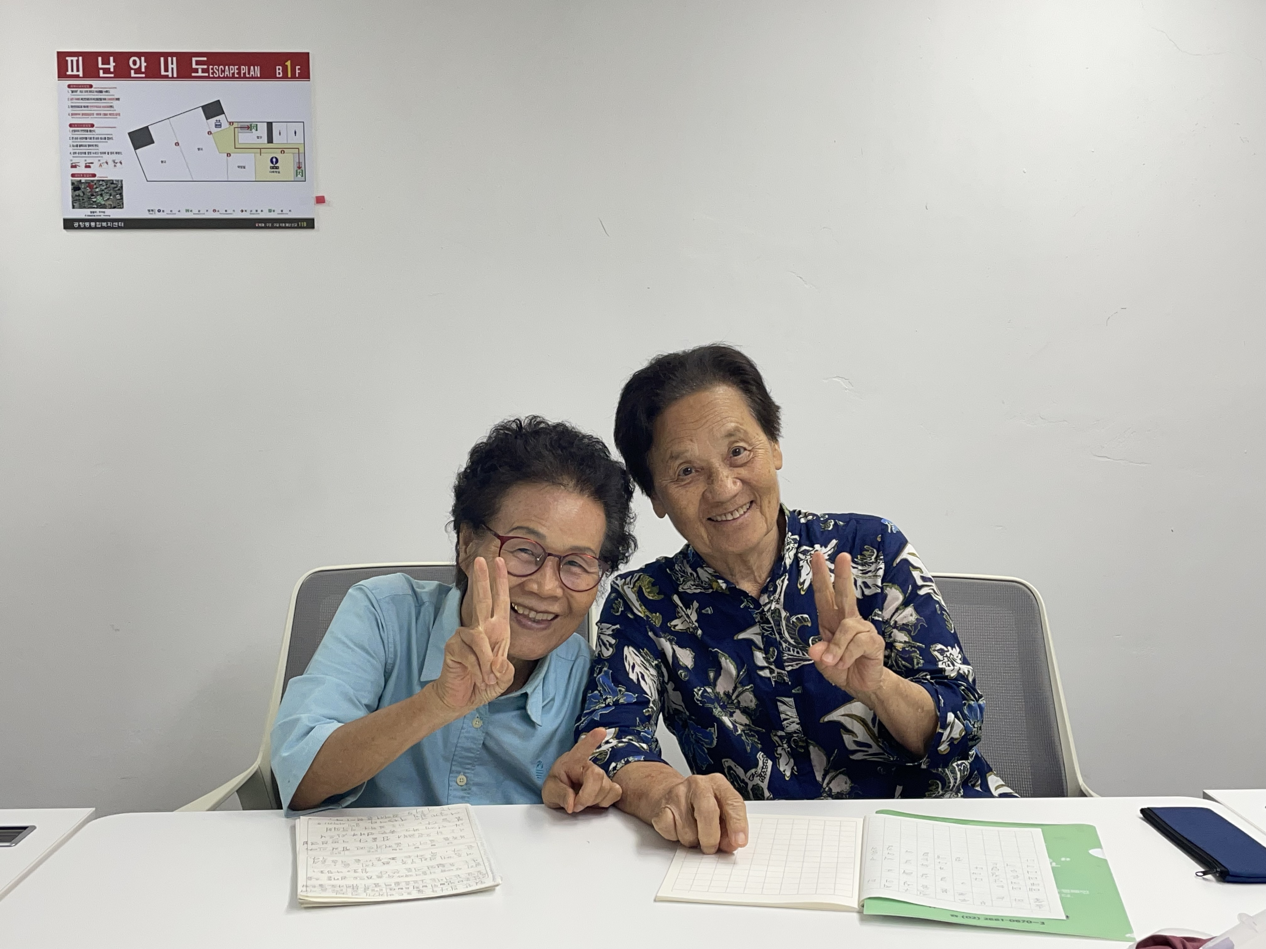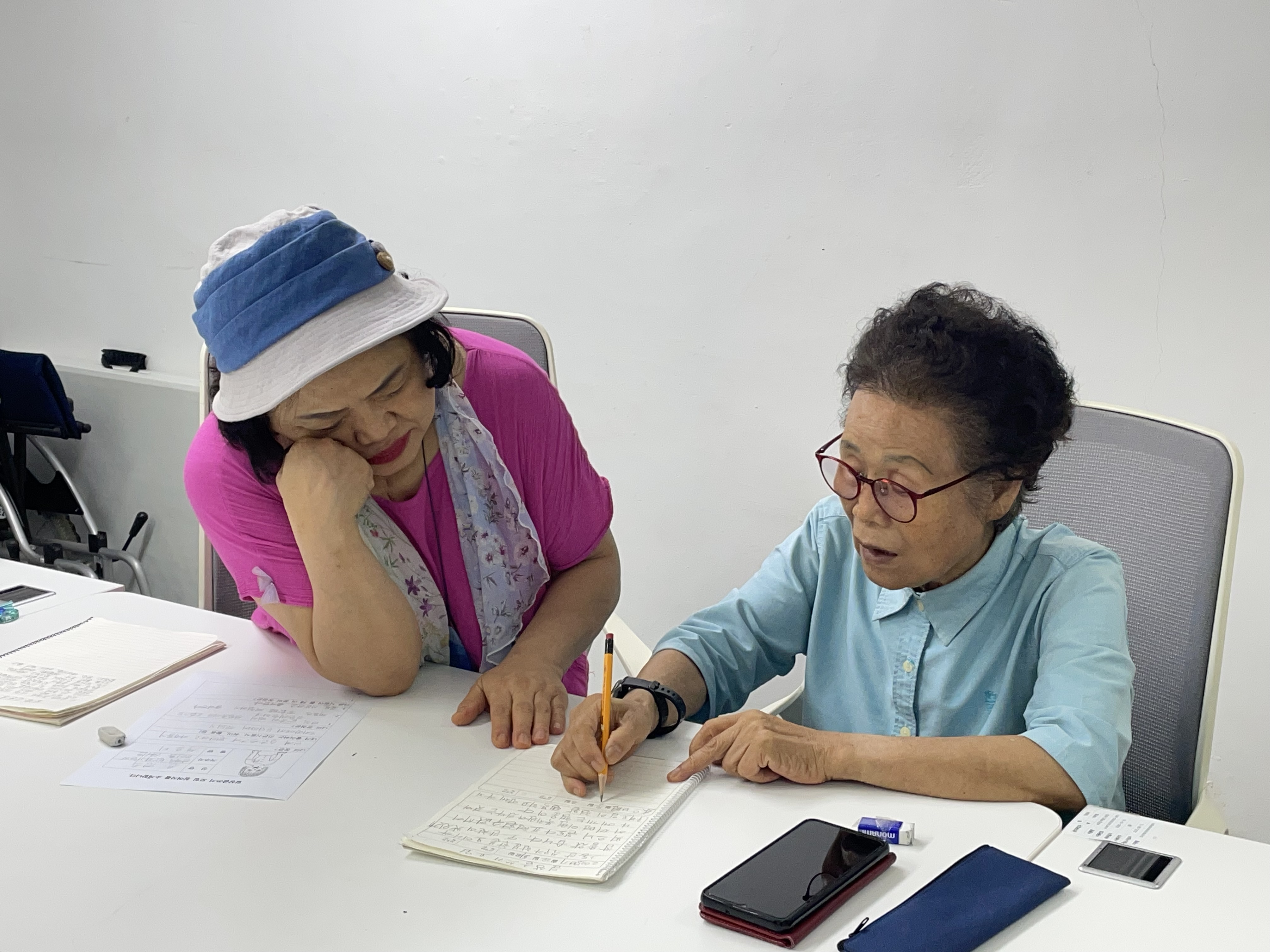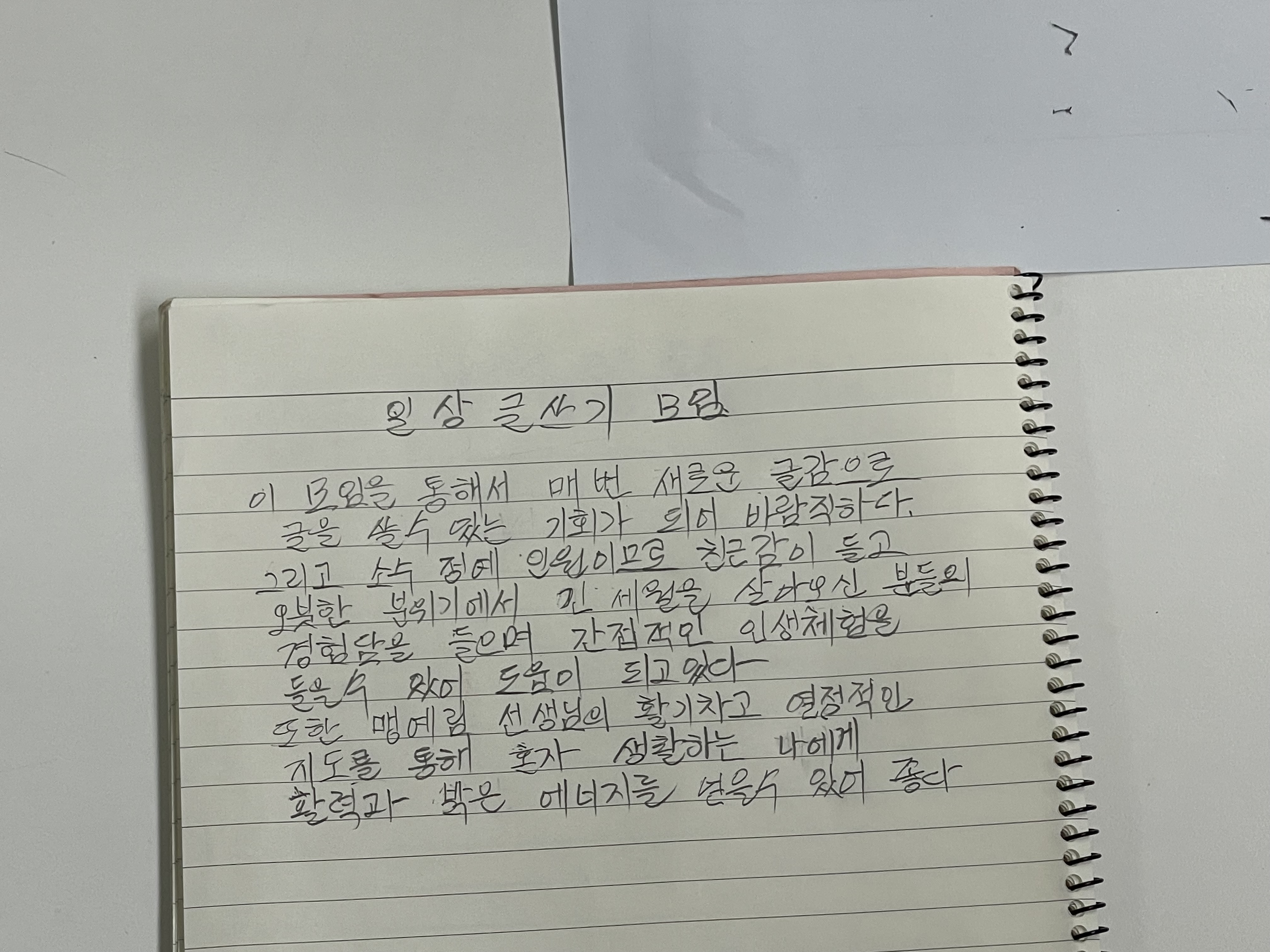 "어르신, 저희 일상글쓰기 모임을 3월부터 계속 진행했는데, 이렇게 모여서 공부하니까 어떠세요?"