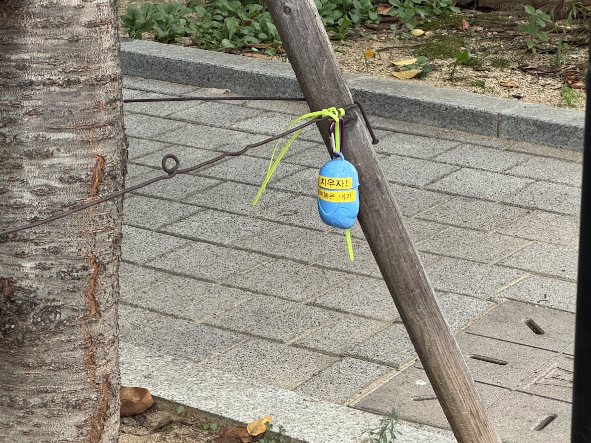 그리고 걷다 보니 블루밍 아파트 나무 쪽에 플라스틱 통이 걸려있는 것을 보았습니다.