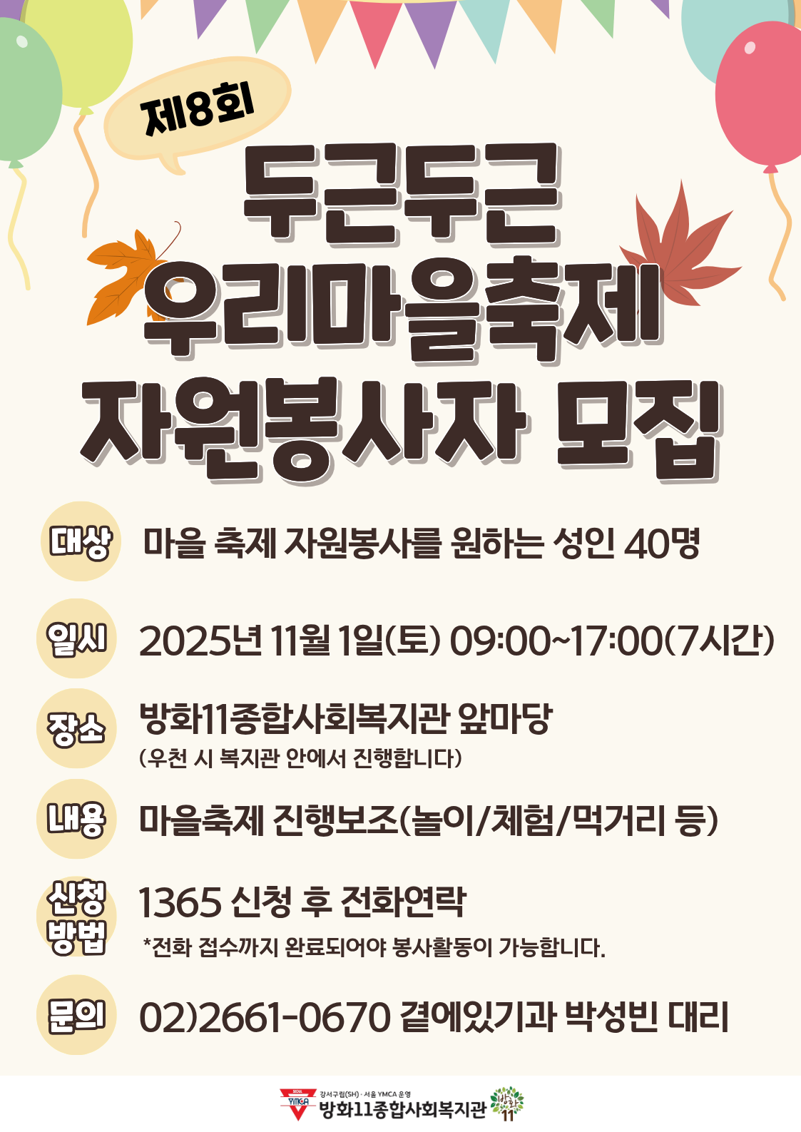 - 방화11종합사회복지관에서 주최하는 마을축제 자원봉사에 참여해서 축제를 빛내주세요!