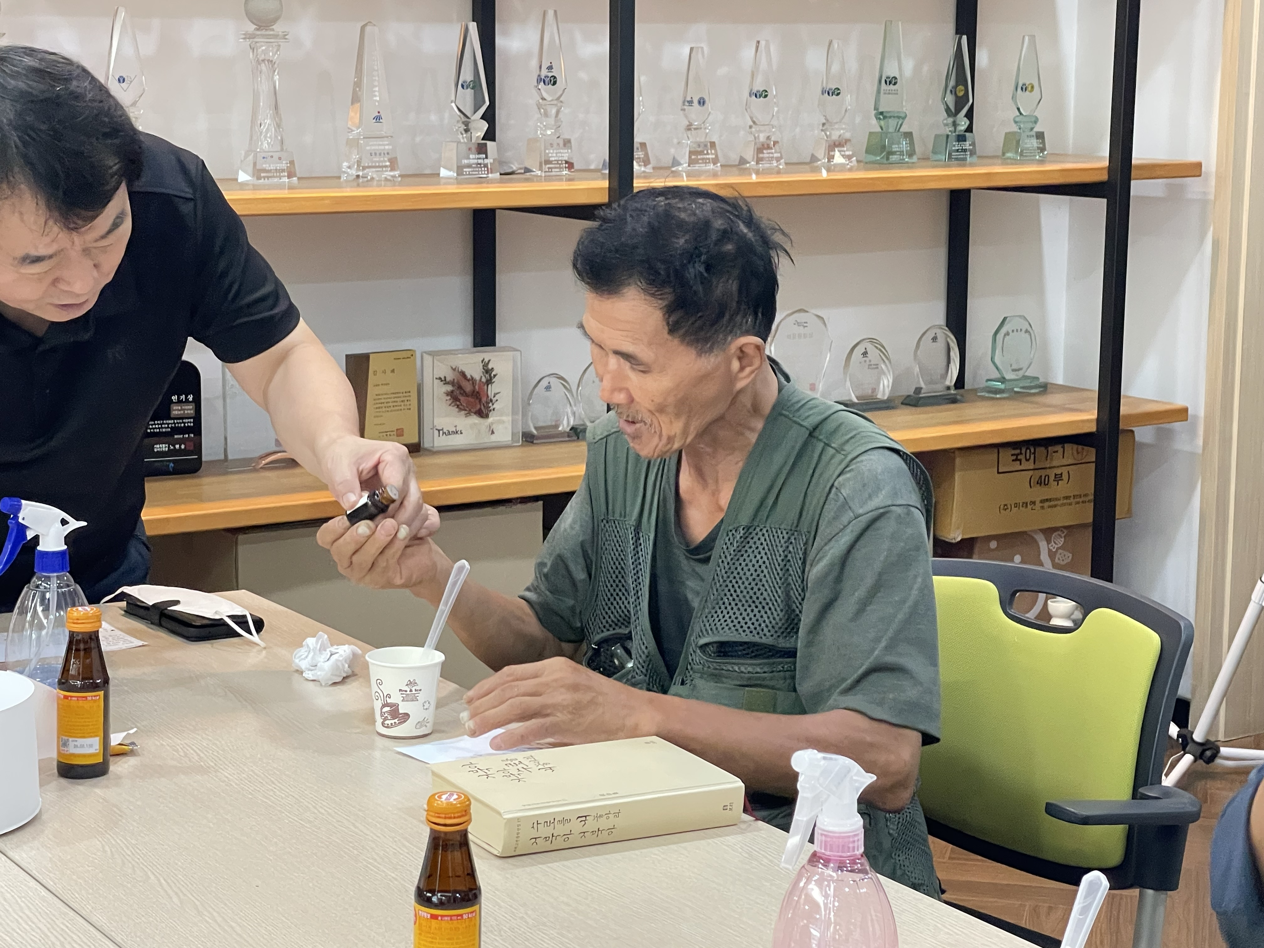 모임의 문을 열며 라벤더 향이 나는 에센셜 오일을 하나씩 맡아보았습니다.