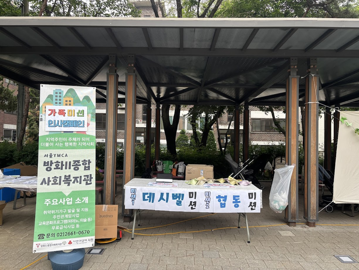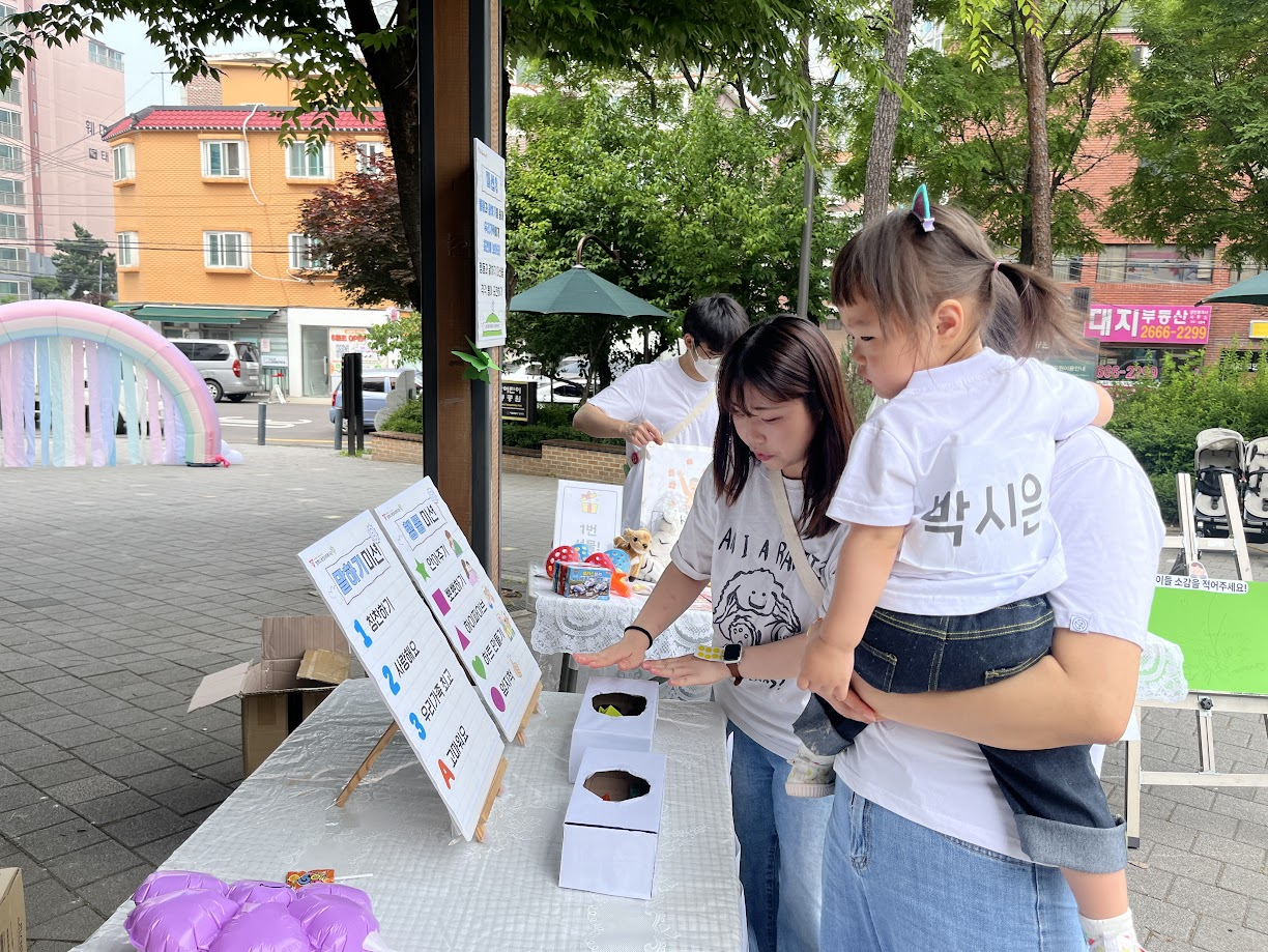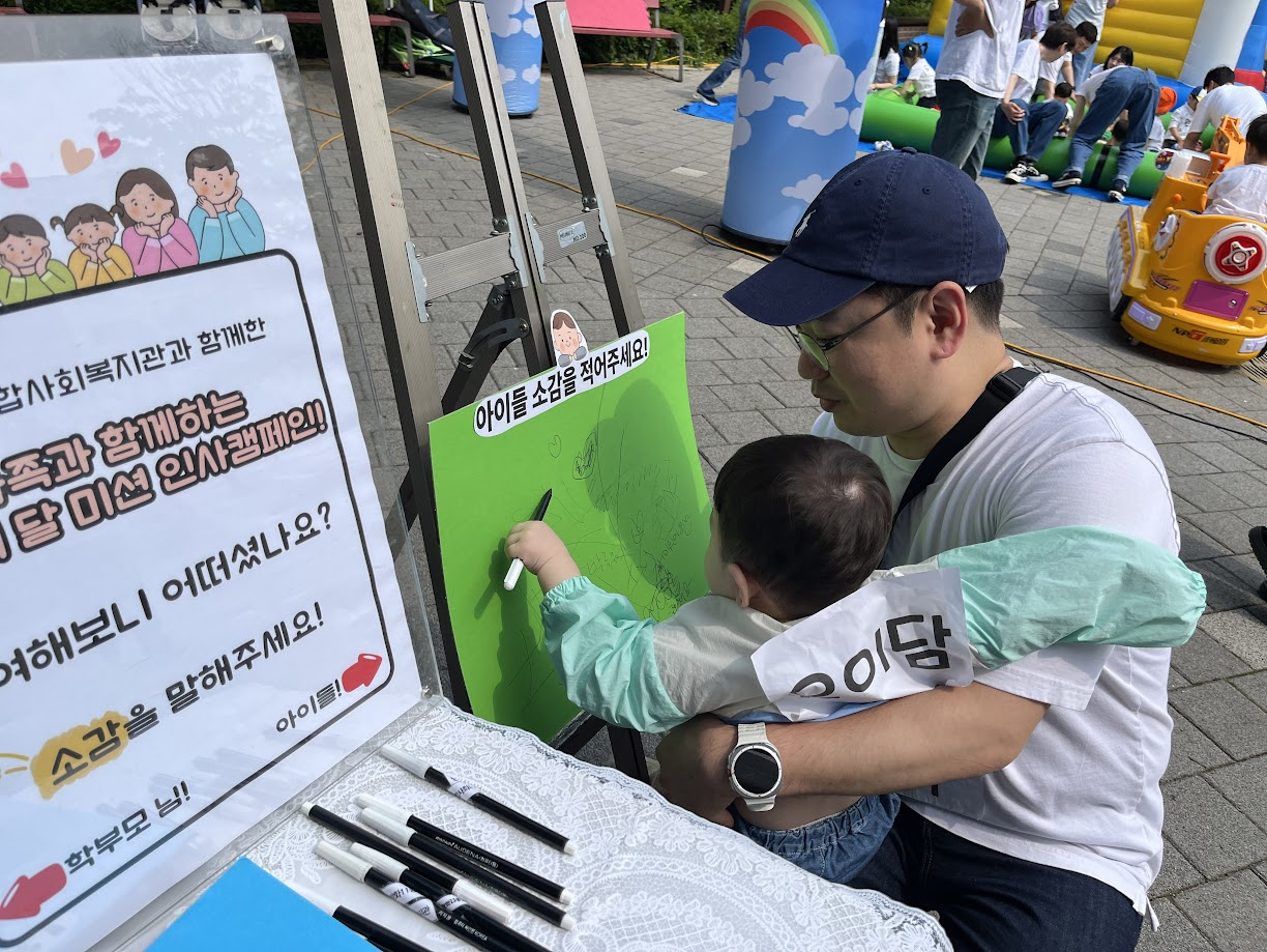 복지관에서도 가족관계를 돕기 위해 소화재 가족운동회에서 한 부스를 맡아 가족 미션 인사캠페인을 진행했습니다.
