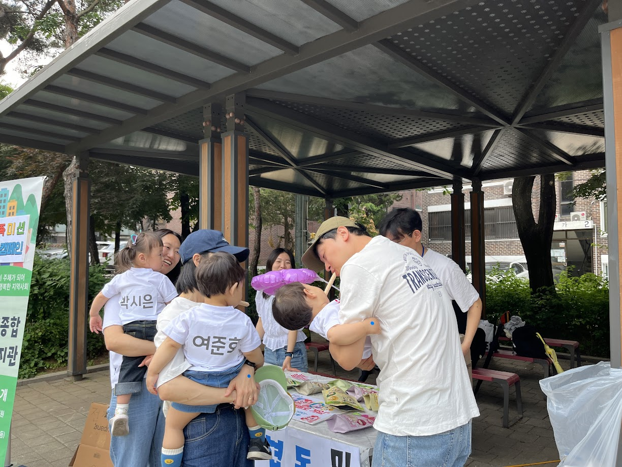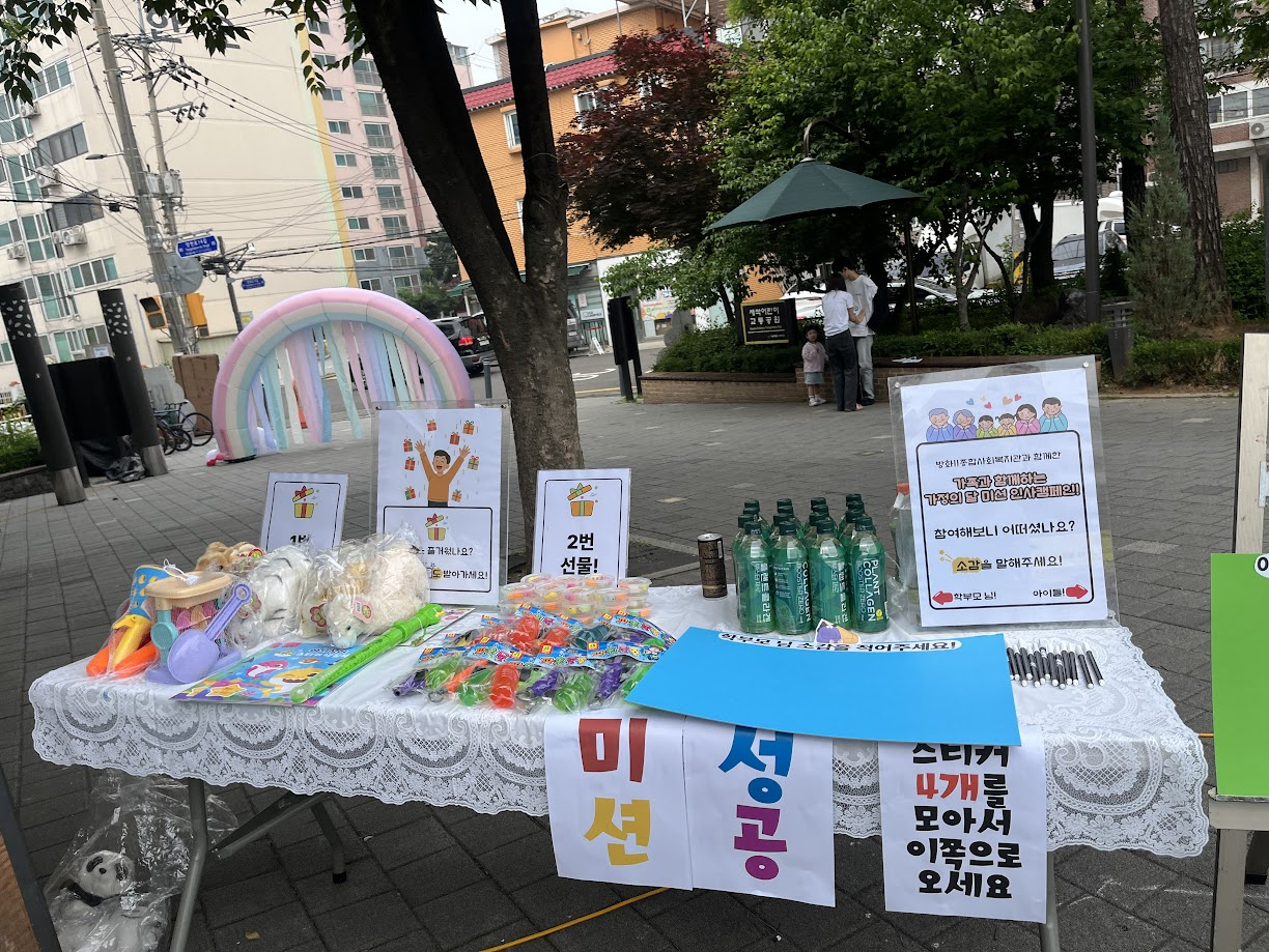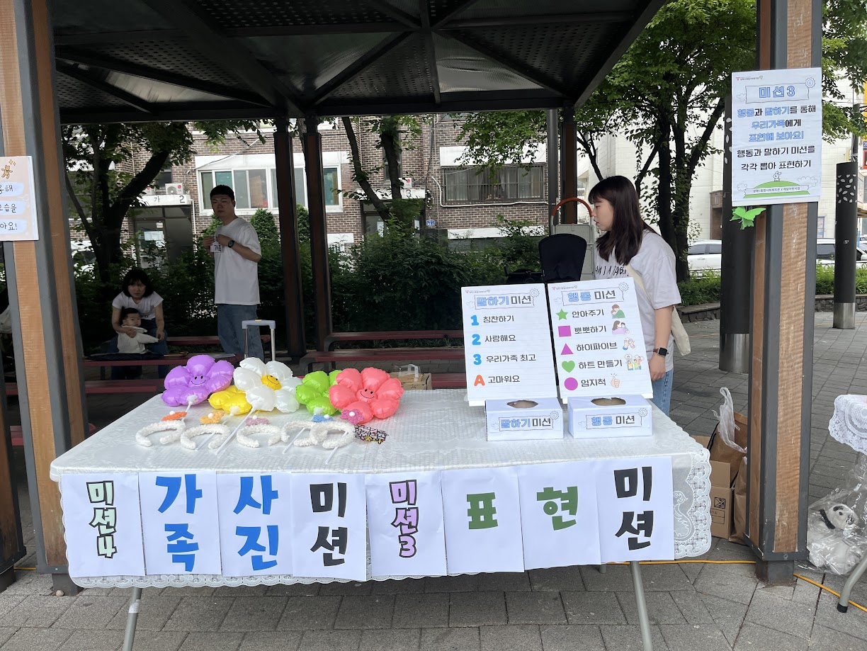 복지관에서도 가족관계를 돕기 위해 소화재 가족운동회에서 한 부스를 맡아 가족 미션 인사캠페인을 진행했습니다.