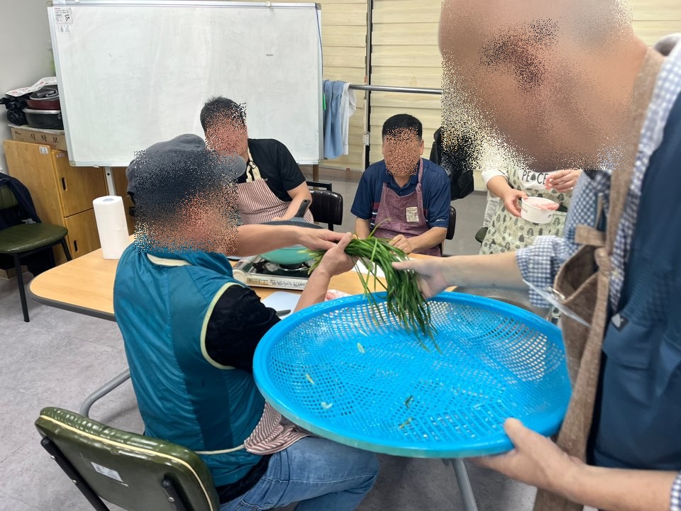 오늘은 **<건강 튼튼! 생활 쏙쏙! 동네수다방 : 열린강좌>**를 통해 복지관과 새롭게 인연을 맺은 아저씨 두 분이 요리모임에 참여하셨습니다. 처음 참석하는 자리라 다소 어색해 하셨지만, 열린강좌에서 이미 인사 나눈 주민들이 함께하여 금세 자연스럽게 어울리며 대화를 나누었습니다.