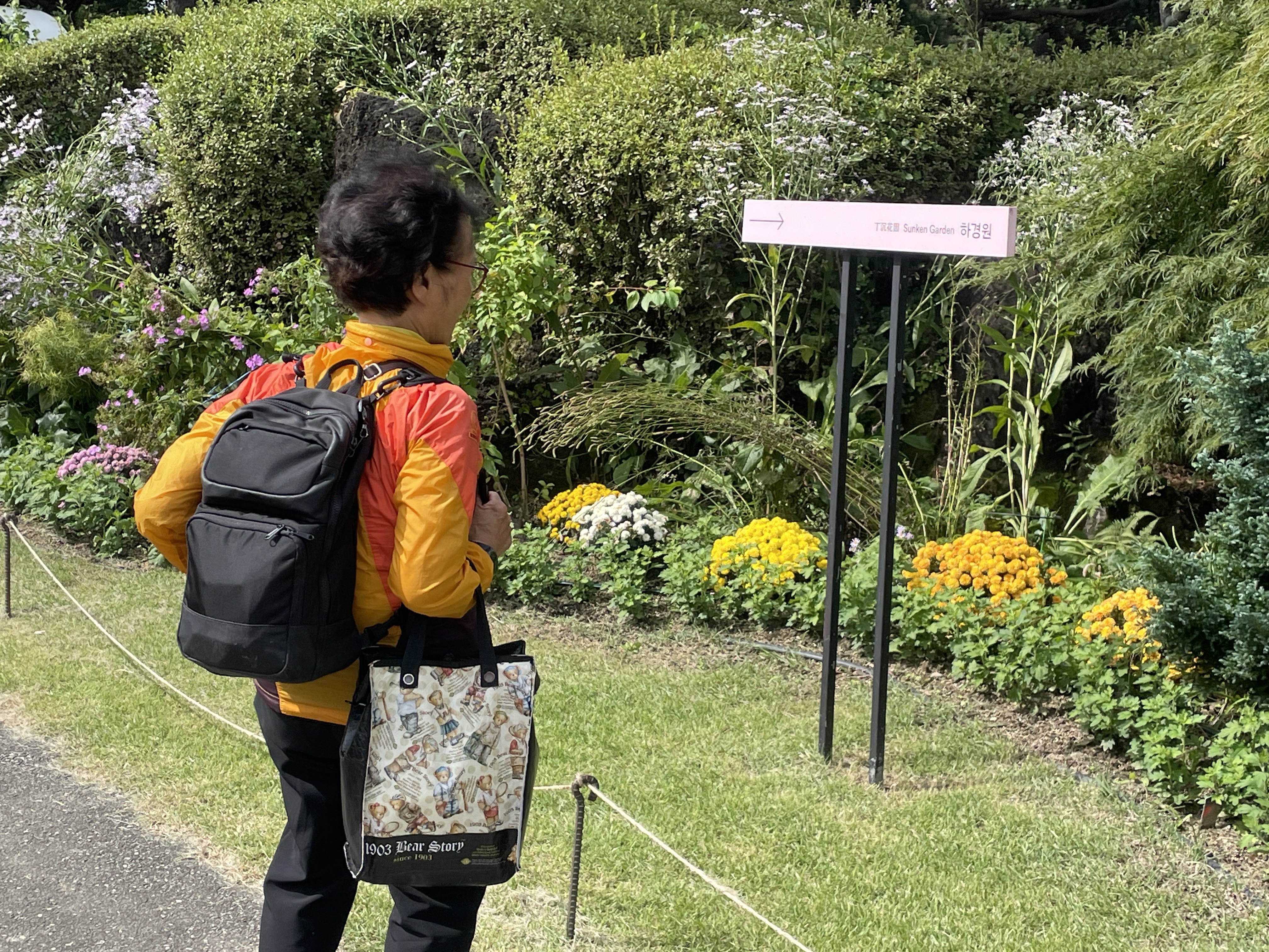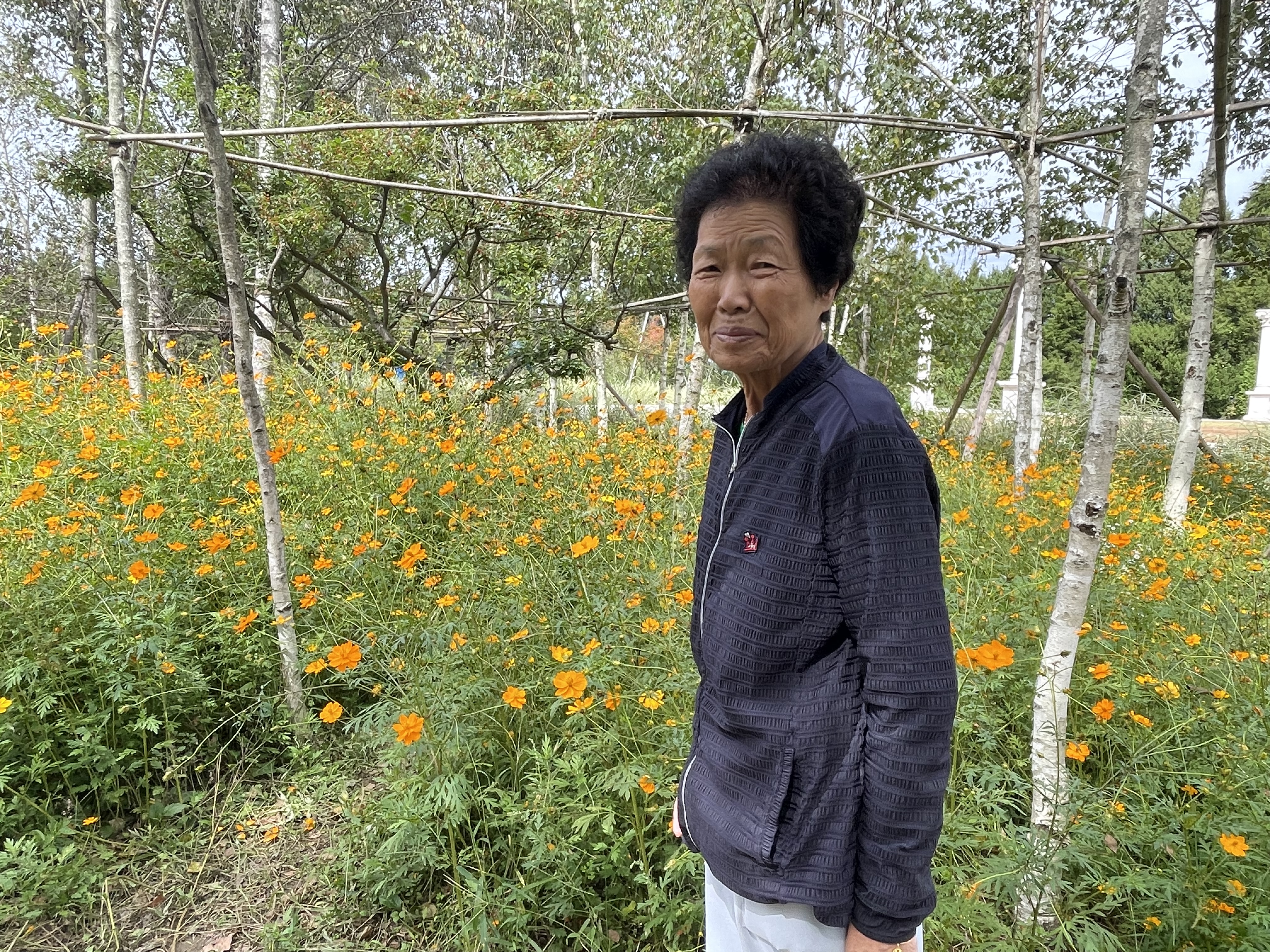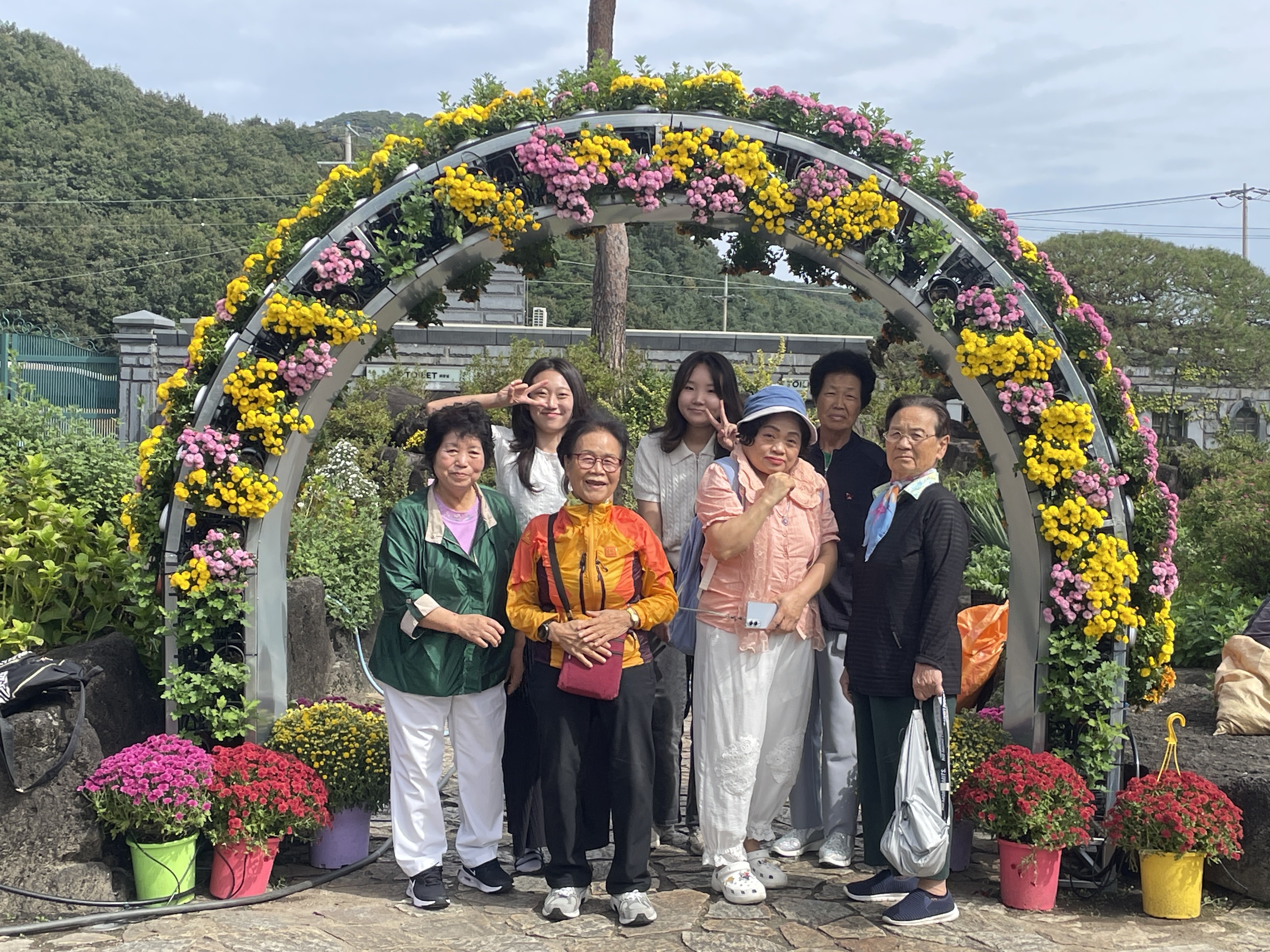 “어르신, 여기 꽃이 이뻐요. 같이 사진 찍어요”