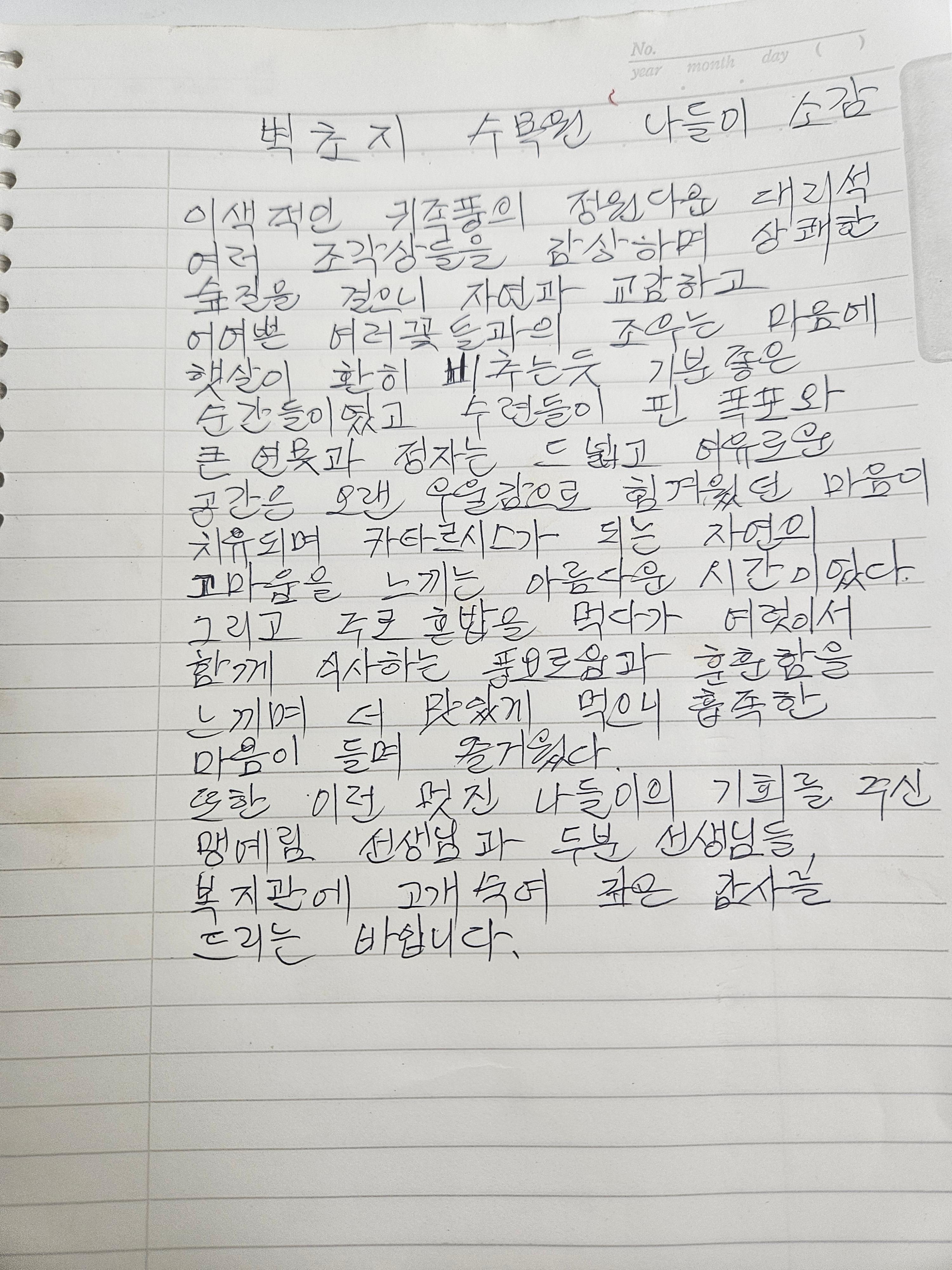 집에서 직접 나들이 소감을 써오셨습니다.