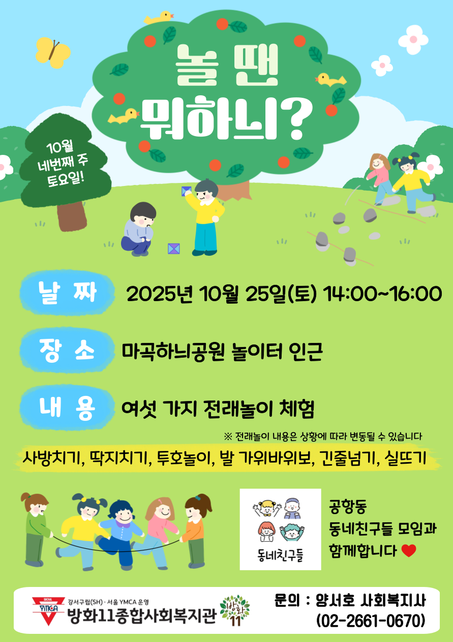 10월 25일(토) 14시~16시에 마곡하늬공원 놀이터 인근에서 전래놀이 축제 '놀 땐 뭐하늬?'를 진행합니다.