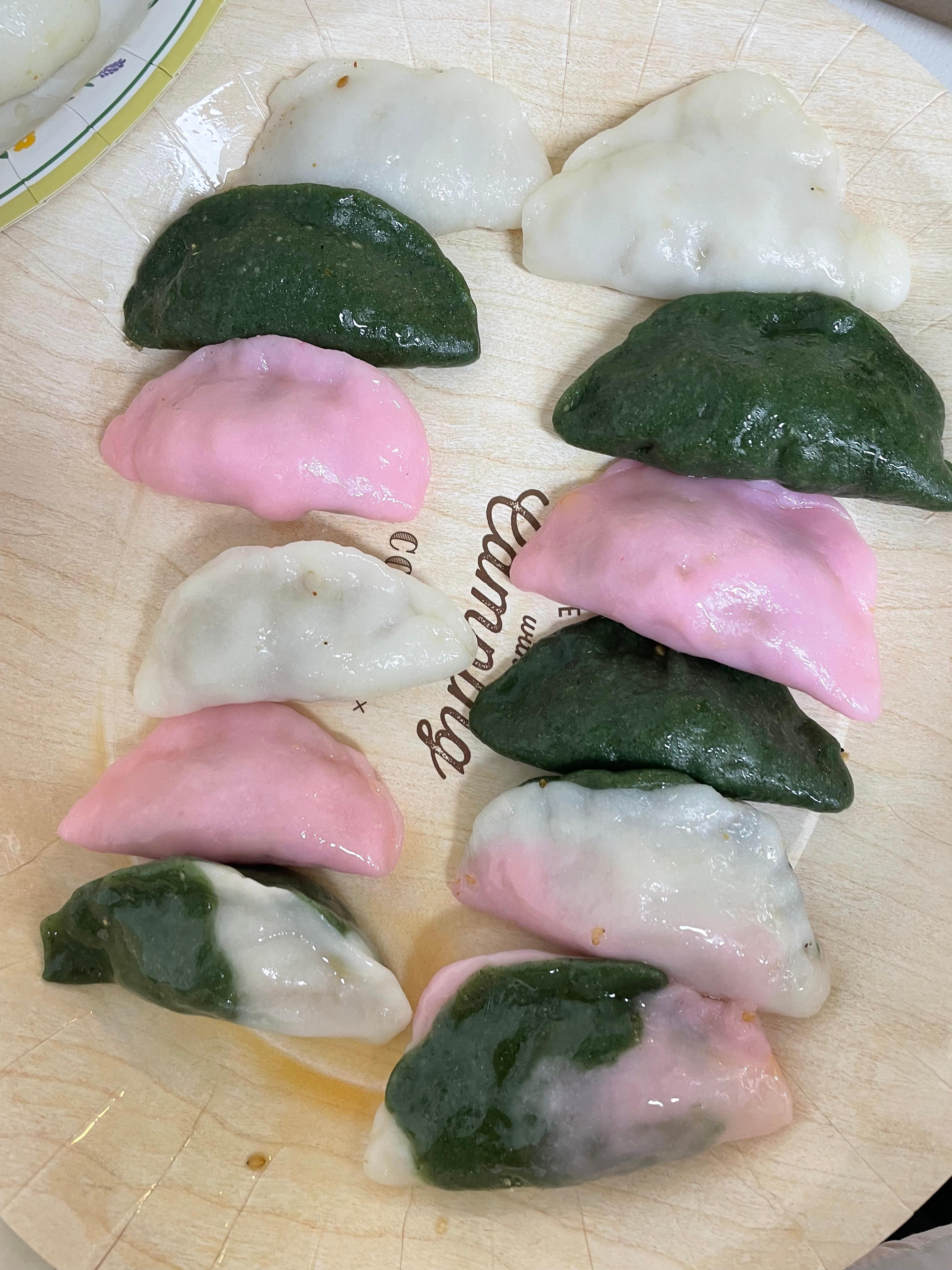 서로의 아이디어가 모여 흰색, 초록색, 핑크색의 삼색 송편이 만들어지기도 했습니다.