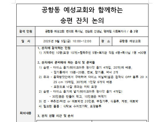 공항동 주민 10명이 모여 송편 잔치를 어떻게 진행하면 좋을지,