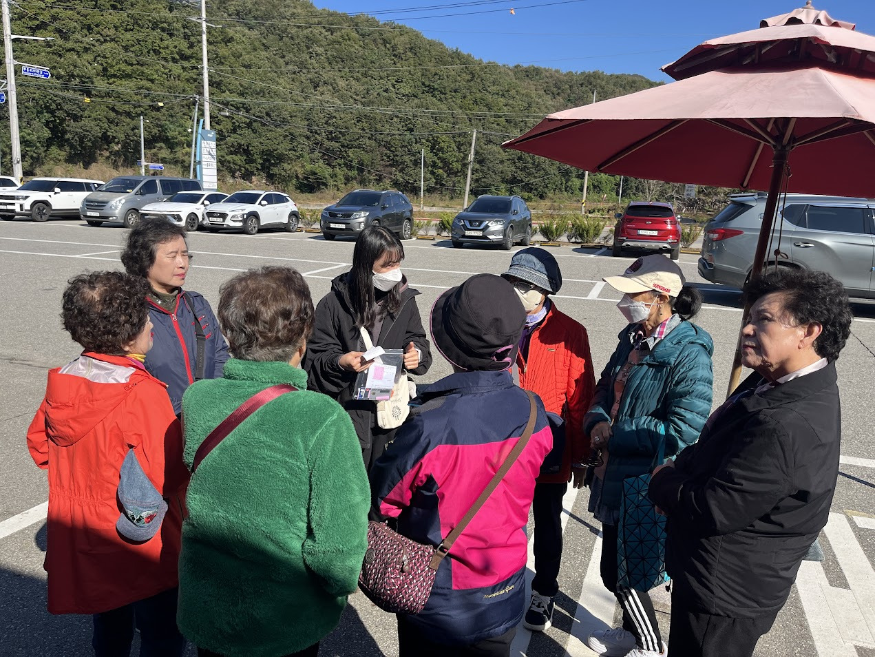 문학 나들이 미션 활동을 공유하기 위해 복지관으로 돌아와 아파트 쉼터에 모였습니다.