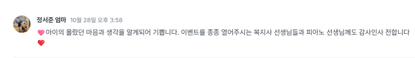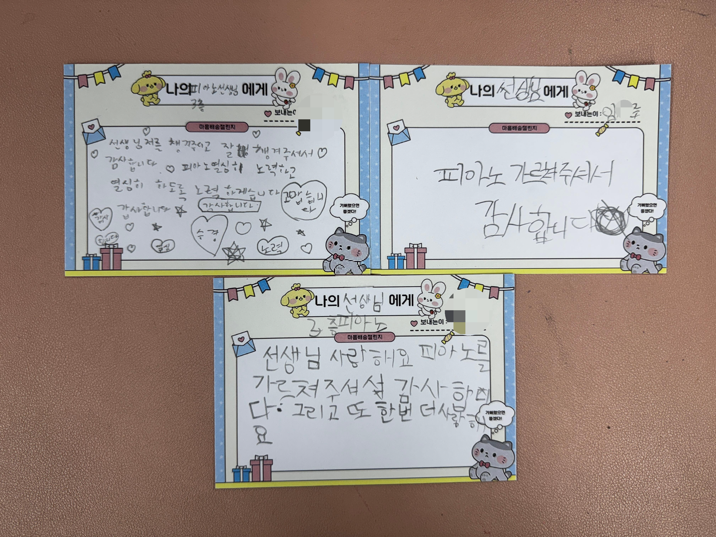 '선생님 저를 챙겨주셔서 감사합니다♡ 피아노 열심히 하도록 노력하겠습니다. 고맙습니다. 감사합니다'