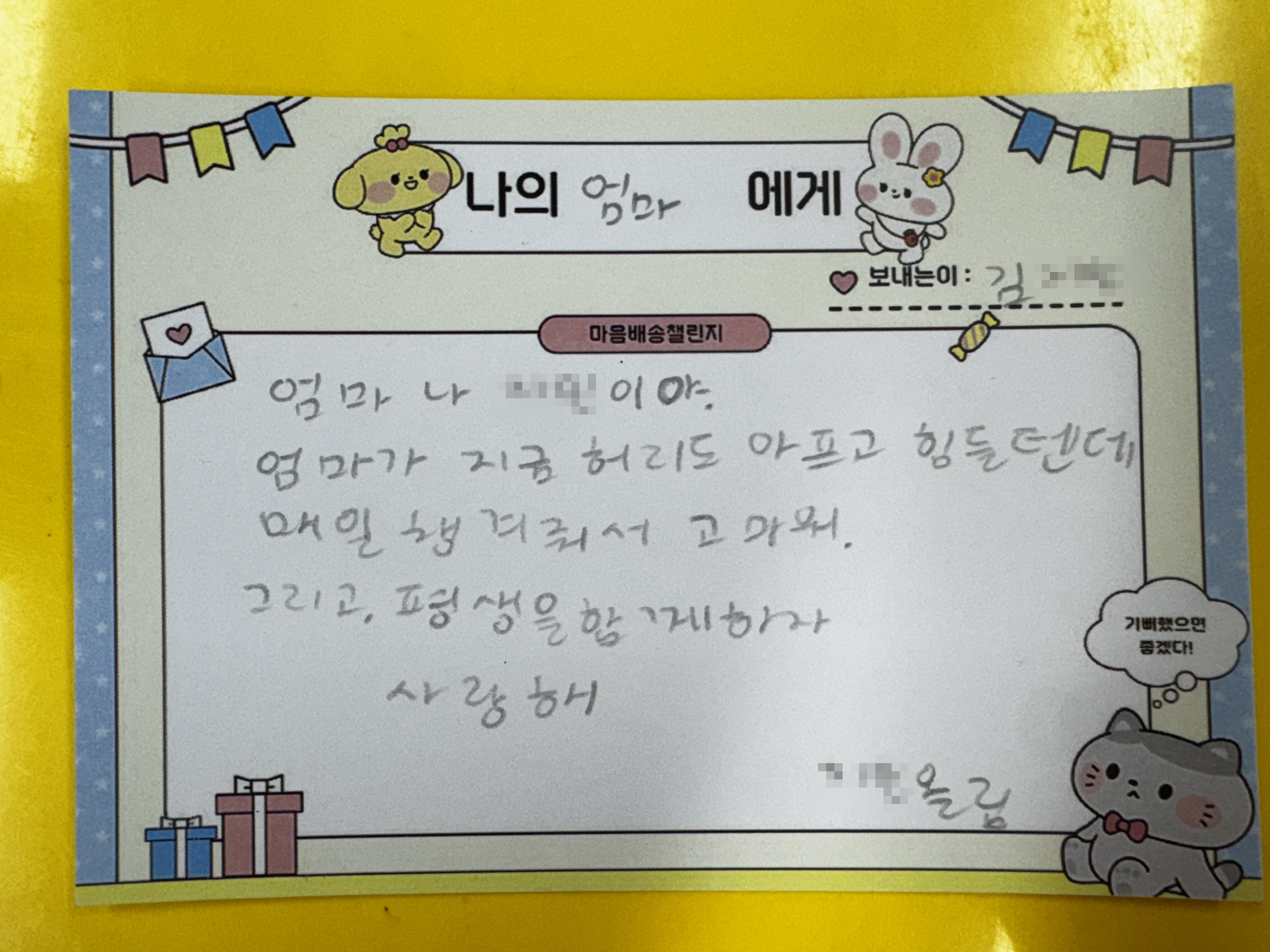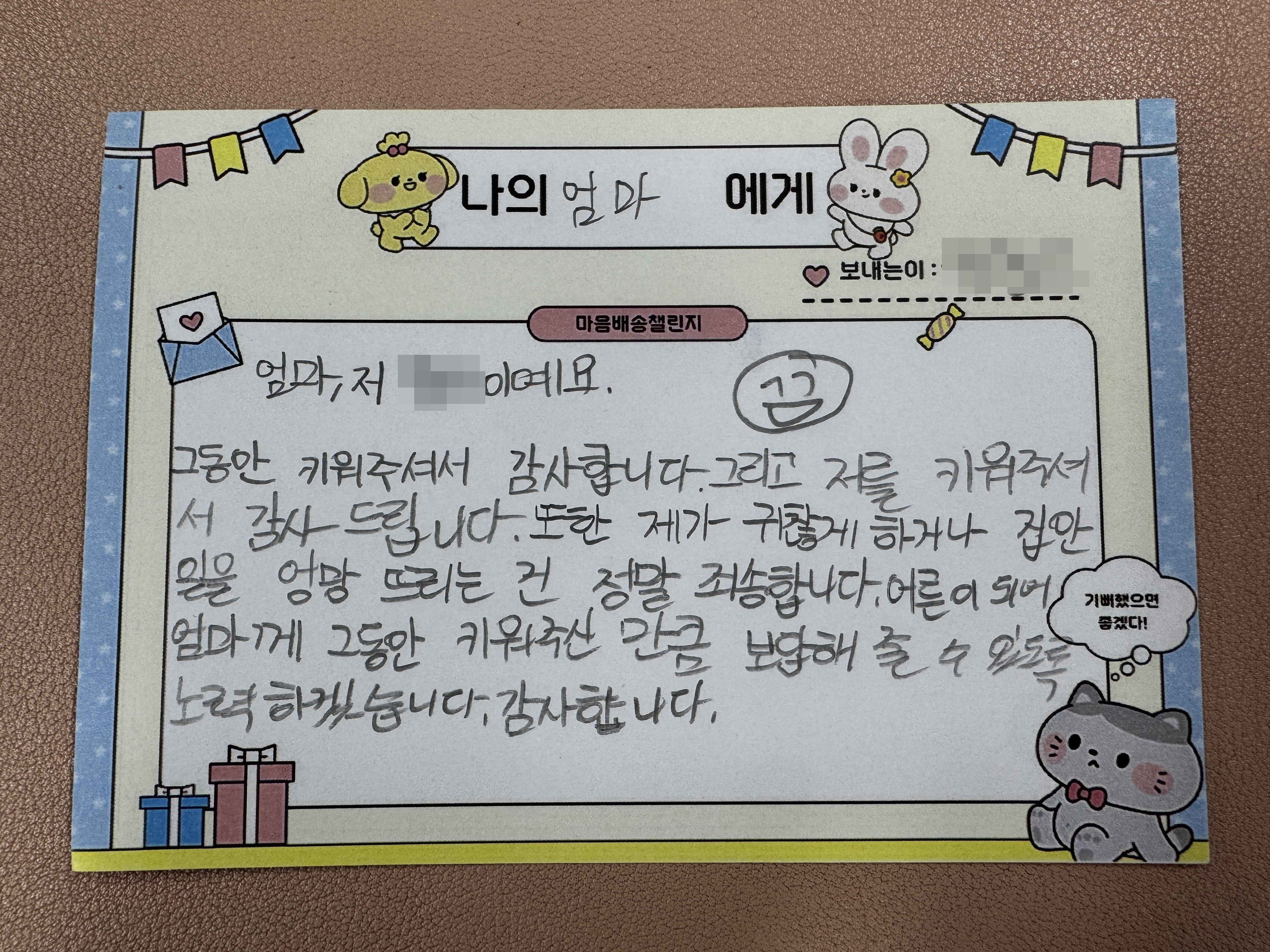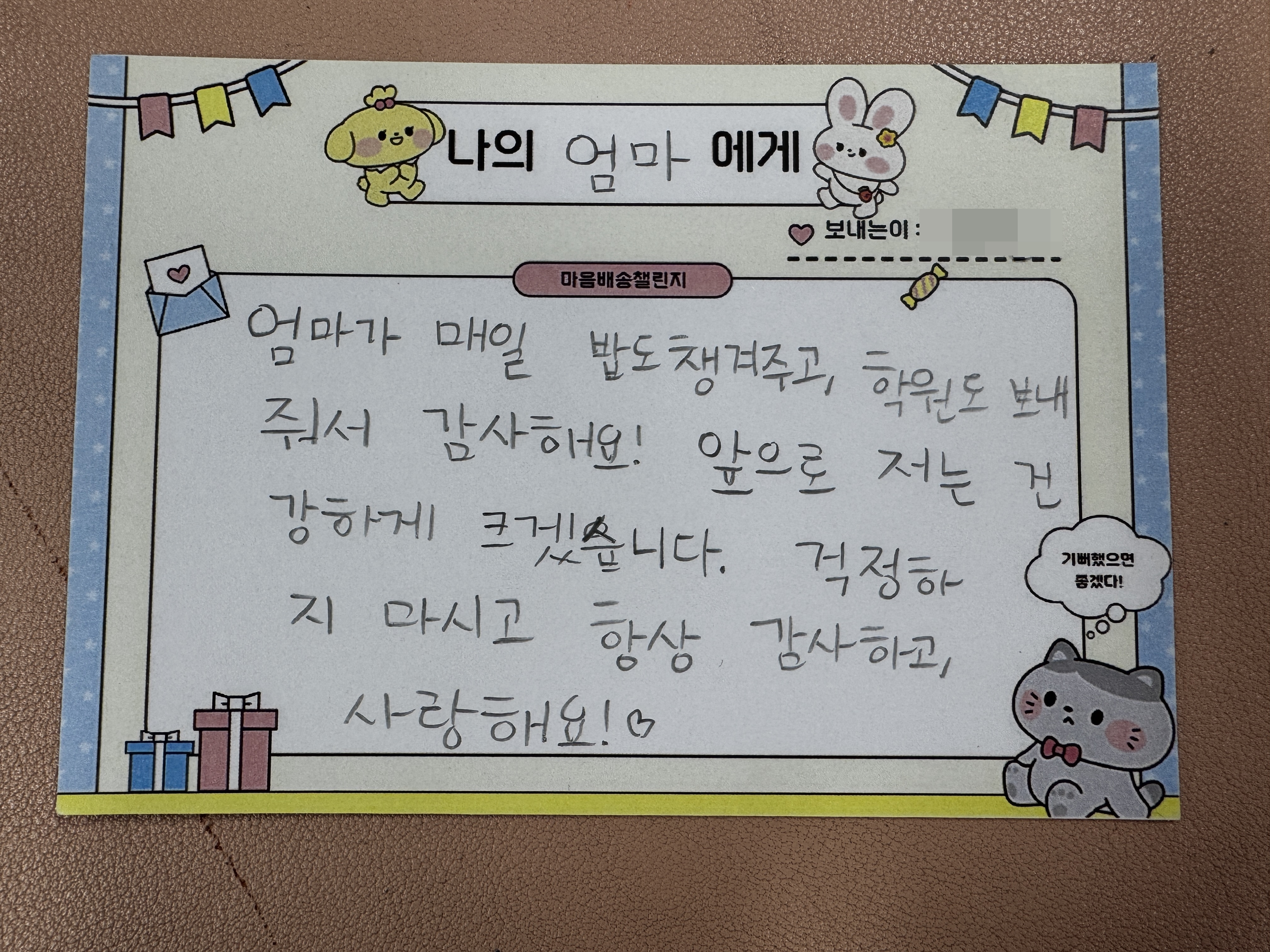 '엄마가 매일 밥도 챙겨주고, 학원도 보내줘서 감사해요! 앞으로 저는 건강하게 크겠습니다. 걱정하지 마시고 항상 감사하고, 사랑해요!♡'