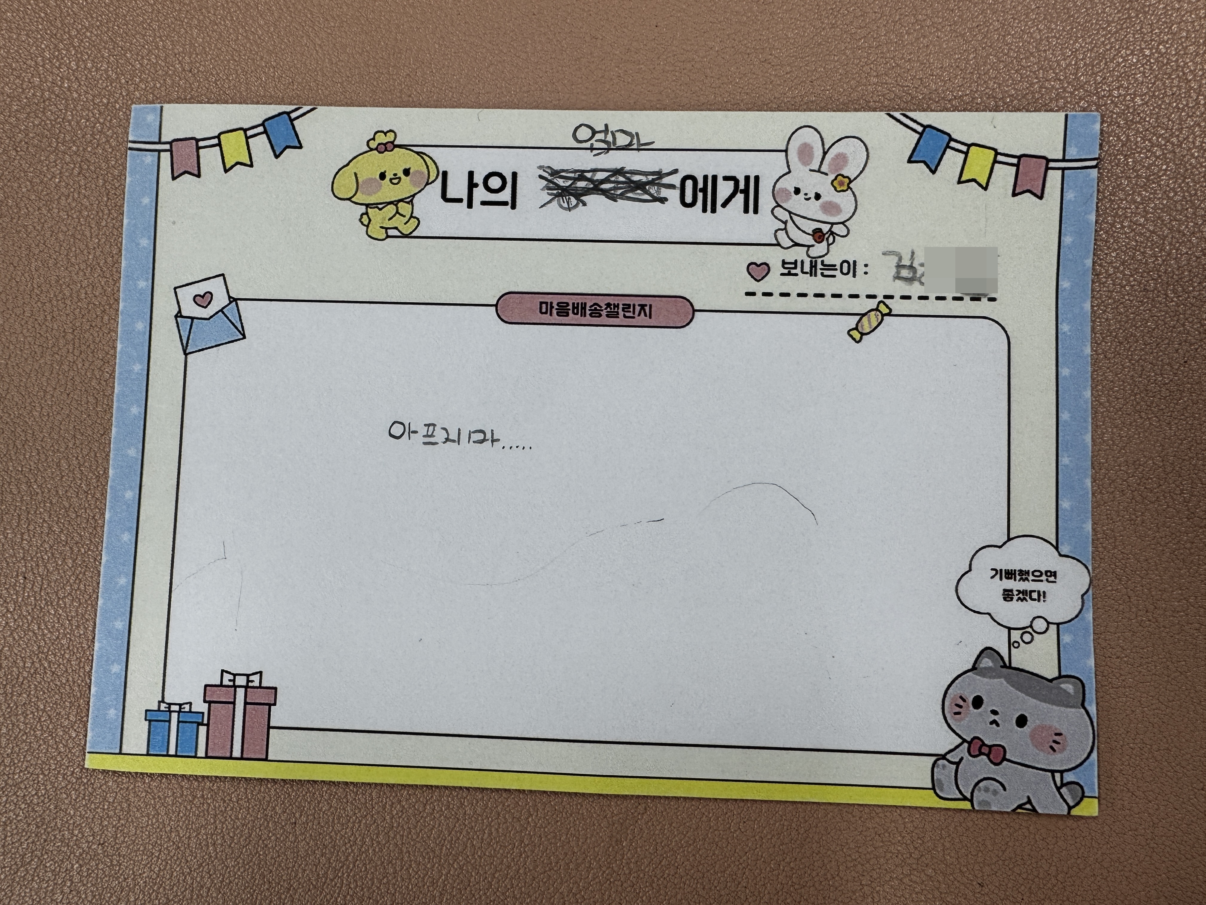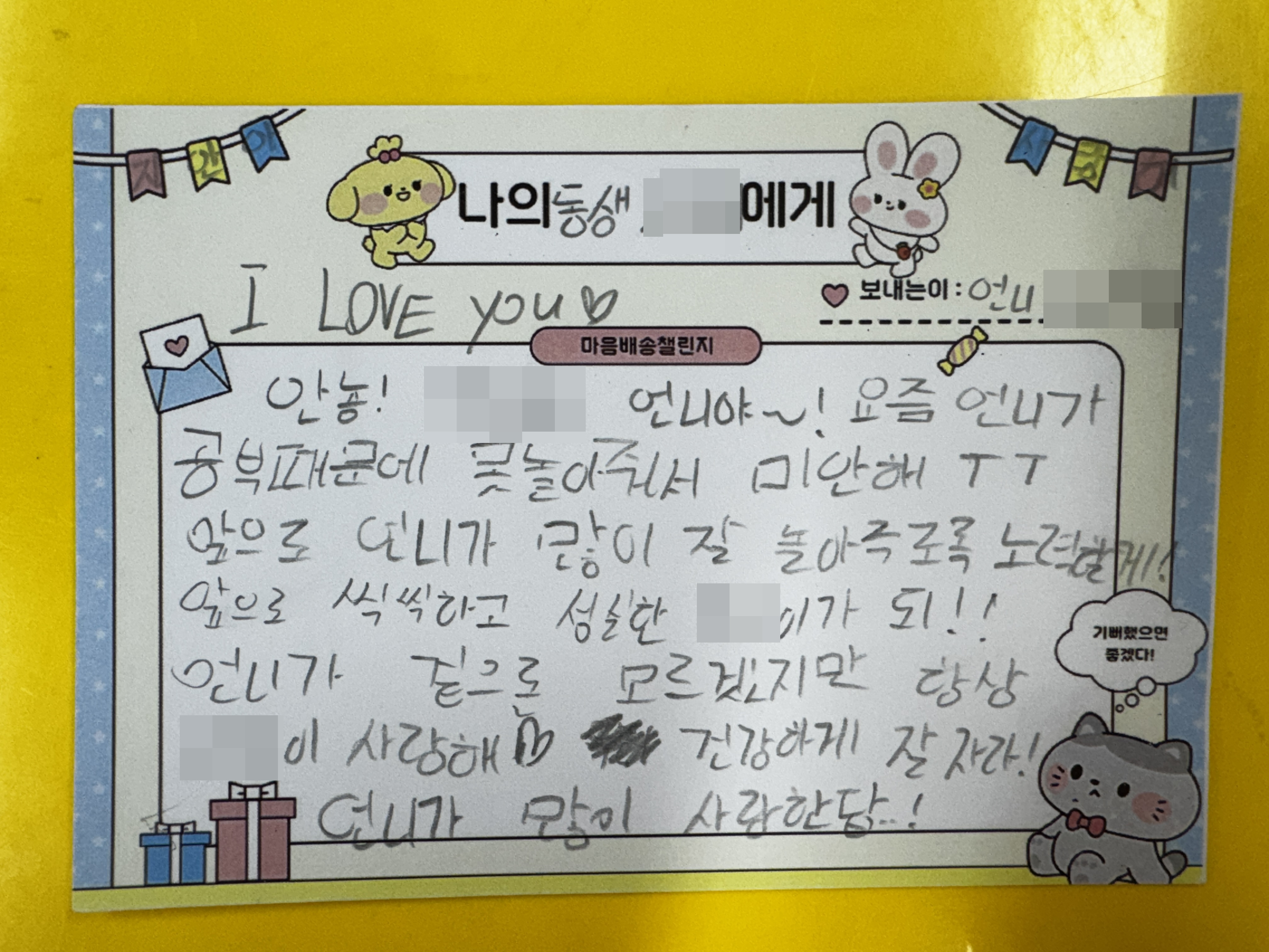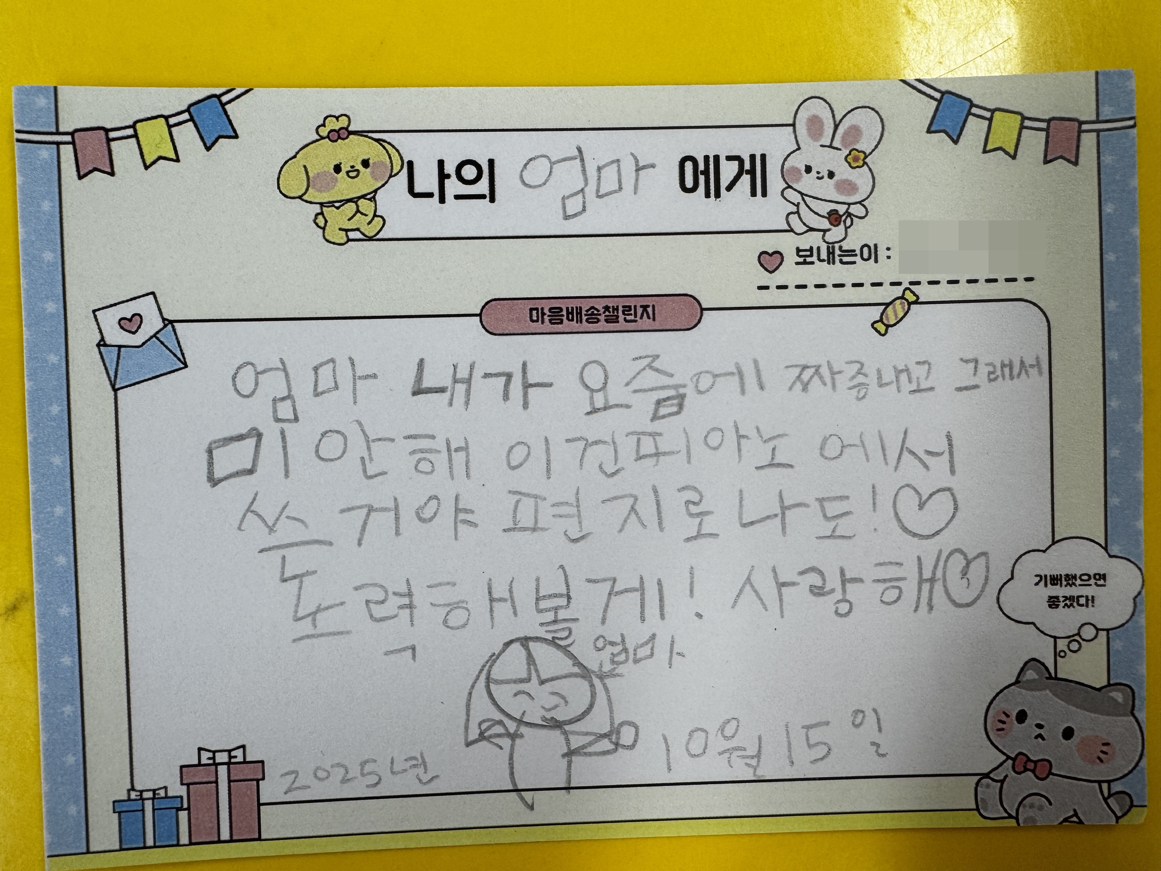 '엄마가 매일 밥도 챙겨주고, 학원도 보내줘서 감사해요! 앞으로 저는 건강하게 크겠습니다. 걱정하지 마시고 항상 감사하고, 사랑해요!♡'