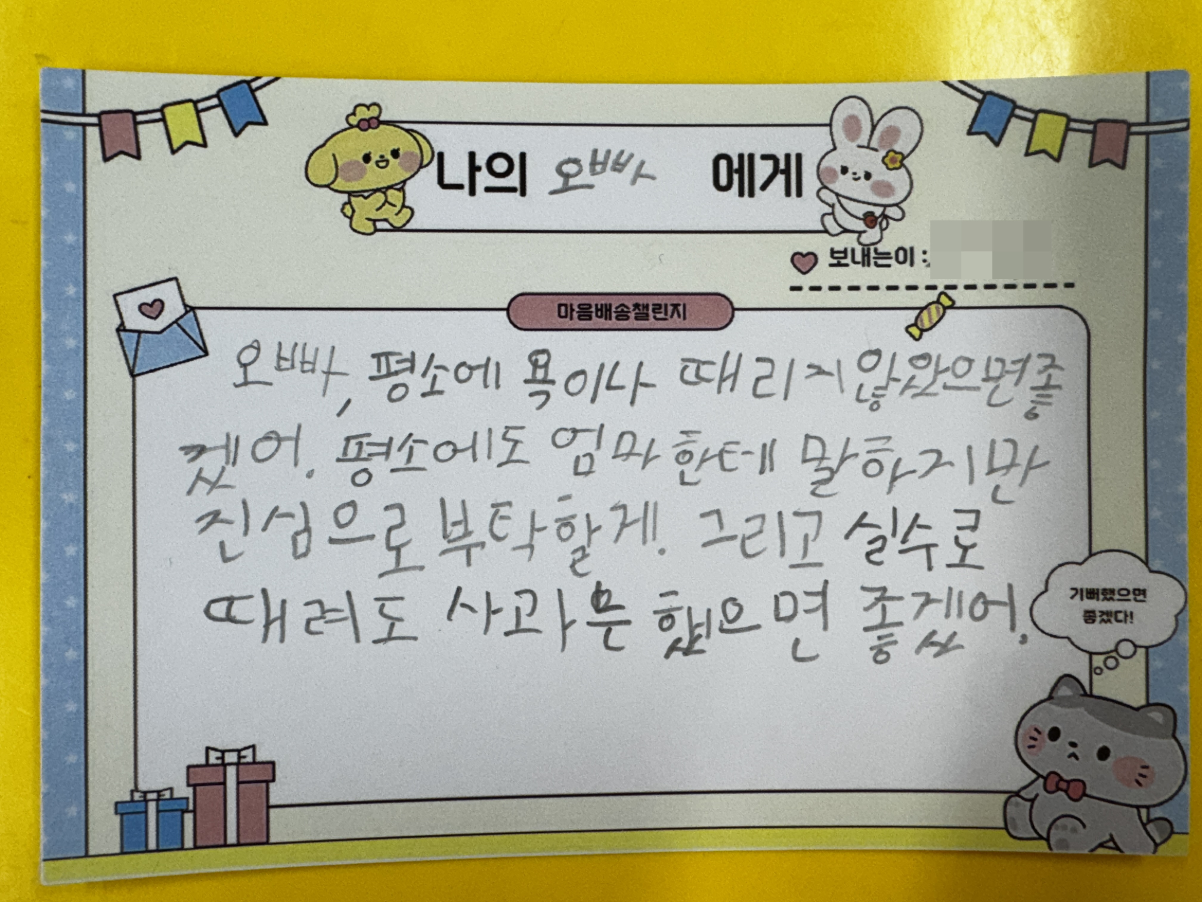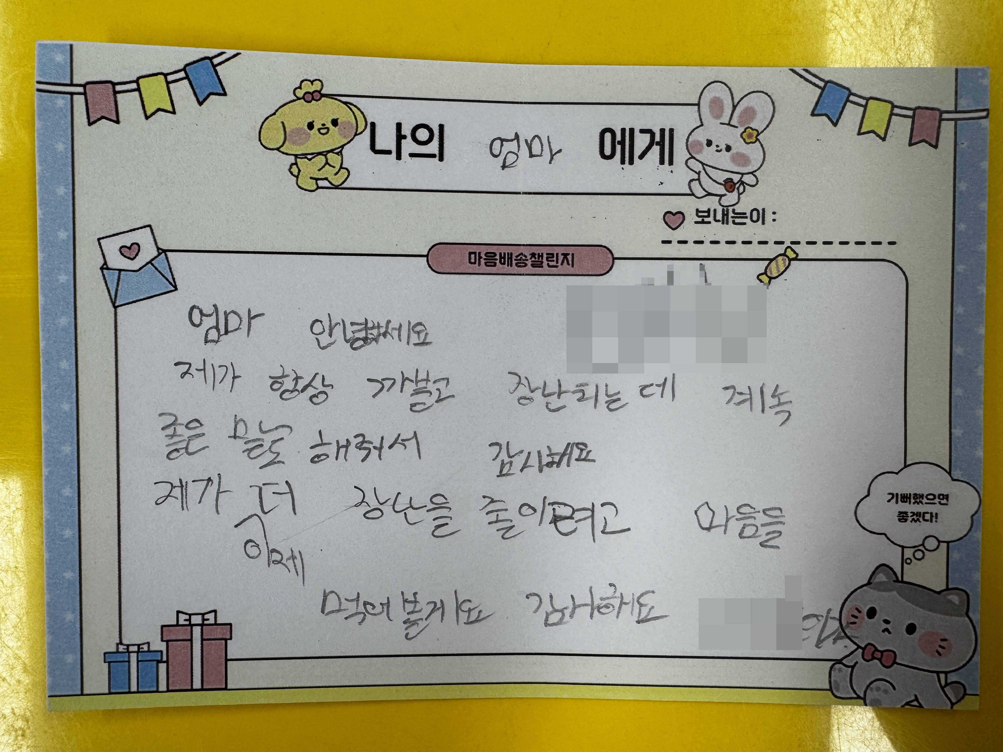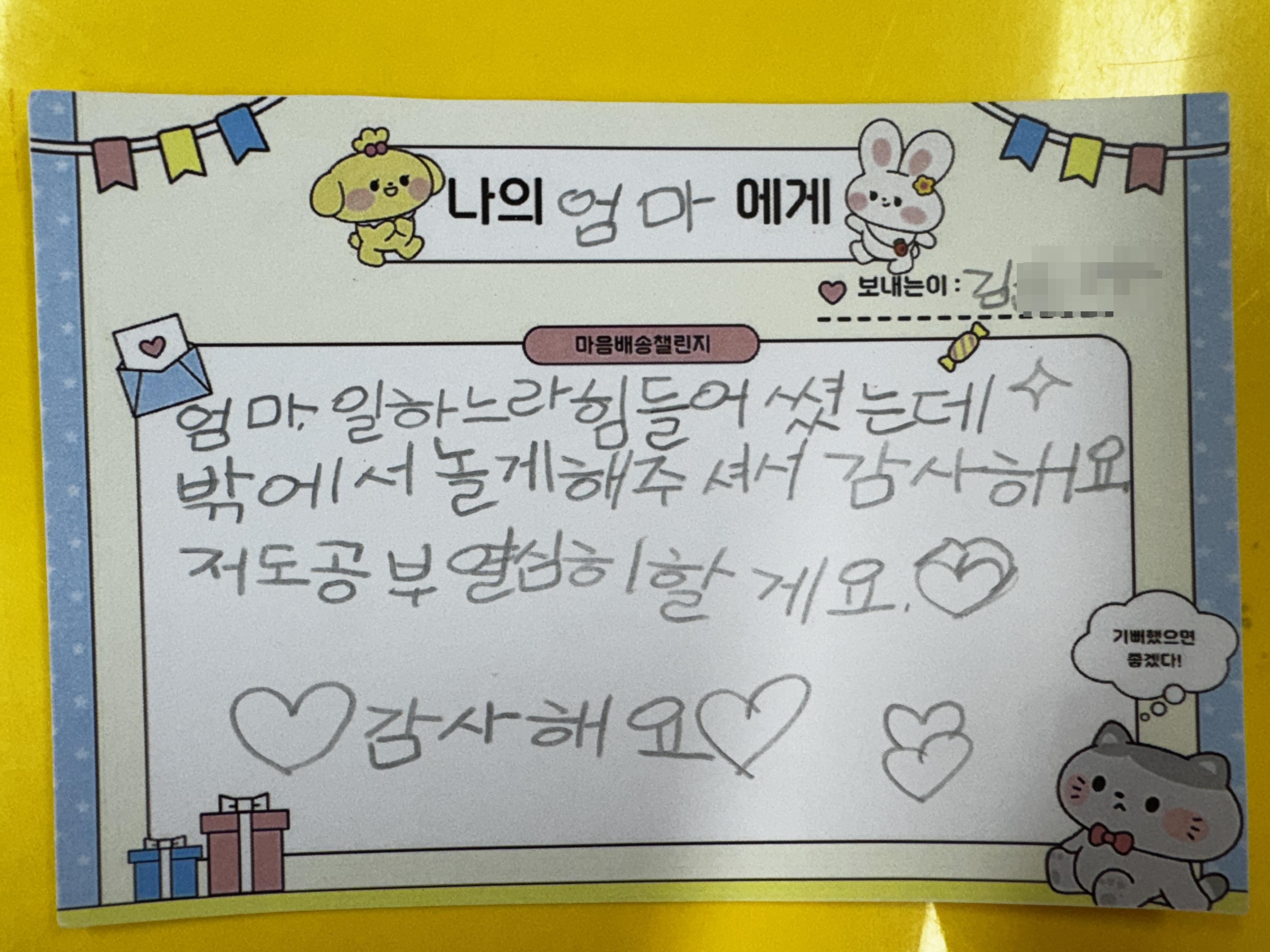 '엄마가 매일 밥도 챙겨주고, 학원도 보내줘서 감사해요! 앞으로 저는 건강하게 크겠습니다. 걱정하지 마시고 항상 감사하고, 사랑해요!♡'