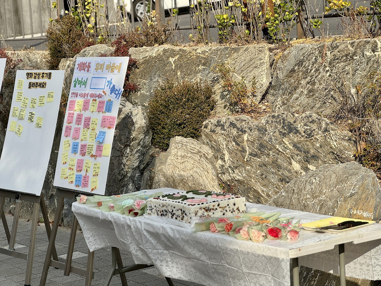 열심히 행사를 준비하고 나니 어느덧 출판기념회 당일이 되었습니다. 출판기념회는 총 3부로 나눠 개화경로당 내부와 앞마당에서 진행했습니다. 1부에서는 영상 상영 부스, 책 전시 및 체험 부스로 나눠 주민들이 자유롭게 우리마을을 주제로 만든 기록과 영상물을 관람했습니다. 2부에서는 작가와 감독으로 활동한 주민들을 소개하고 축하했습니다. 주민들께서 동네 잔치인데 떡이 빠질 수 없다며 근사한 떡 케이크를 맞춰주셨습니다. 함께 케이크를 자르며 작가, 감독님들께 축하의 의미로 꽃다발을 전했습니다. 이후에는 1부에서 부스를 관람하며 주고받은 이야기를 공유했습니다. 마지막 3부에서는 함께한 주민들과 함께 사진을 촬영하며 행사를 추억했습니다.