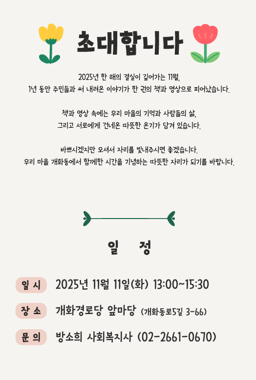 2025년 개화동 문집 사업을 통해 주민들과 함께 걸어가는 법을 배웠습니다. 한마음 한뜻으로 우리 마을 이야기, 내가 살아온 이야기를 잘 담아보자는 작가님들의 마음이 모이는 과정을 보며 참 즐거웠습니다. 주민들 뿐만 아니라 개화동 문집 사업을 진행하는 데 큰 힘이 되어준 손가영 대학생 활동가, 다시서점 김경현 대표님, 예울비디오 이예울 님께도 깊이 감사드립니다. 앞으로도 복지관에서 주민들이 함께 어울리고 더불어 살아가는 지역을 만들기 위해 애쓰겠습니다.