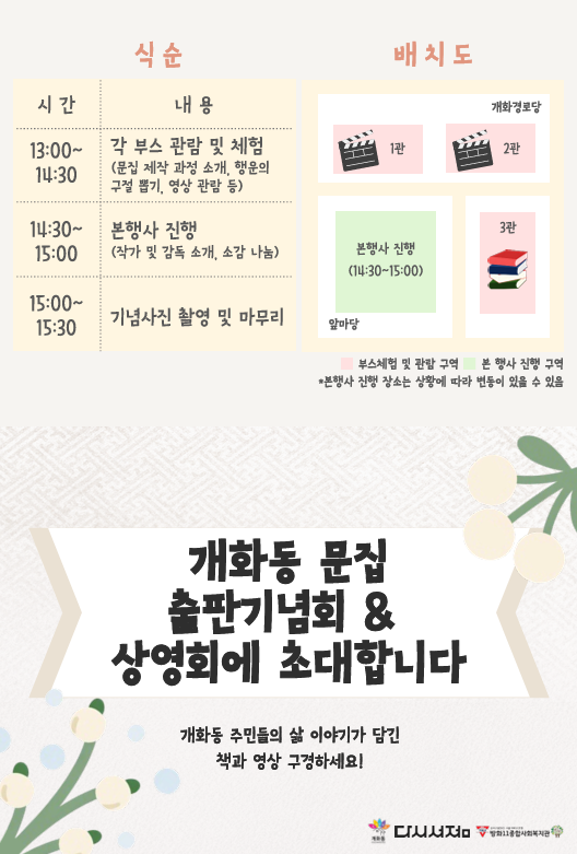 이런 과정을 거쳐 책『개화동 – 웃음꽃, 사람꽃, 이야기꽃이 가득한 우리 마을』을 출판했습니다. 19명의 작가님들과 소박하게 출판의 기쁨을 나누는 것도 좋지만 이웃과 함께 한다면 더욱 풍성한 응원과 기쁨을 나눌 수 있겠다 싶었습니다. 이런 마음을 담아 작가님을 비롯한 개화동 주민들과 함께하는 출판기념회를 기획했습니다. 마침 올해 공항동에 있는 독립서점인 ‘다시서점’에서 개화동 주민들과 함께 ‘나와 마을에 얽힌 이야기’를 영상으로 제작하는 작업을 했습니다. 영상 상영회와 출판기념회를 함께 하면 1년의 결실을 함께 나누며 풍성하게 이룰 수 있을 것 같아 다시서점과 함께 출판기념회를 준비했습니다.