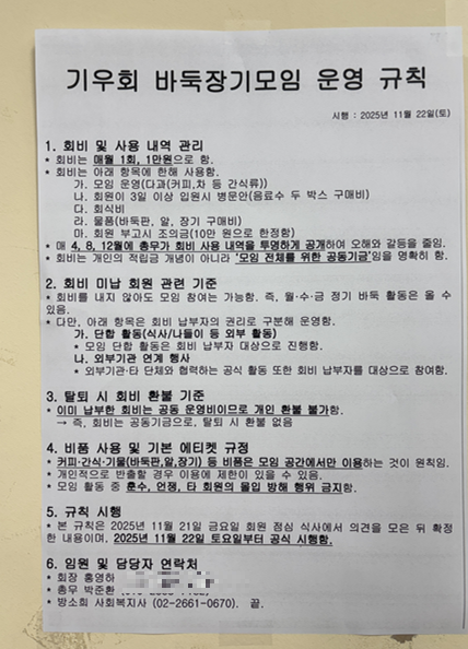 회원님들과 몇차례 의논을 거쳐 바둑장기모임 운영 규칙이 탄생했습니다. 규칙이 궁금하신 분들은.. 바둑모임이 진행되는 별관 4층 프로그램실에 가시면 볼 수 있습니다!😁