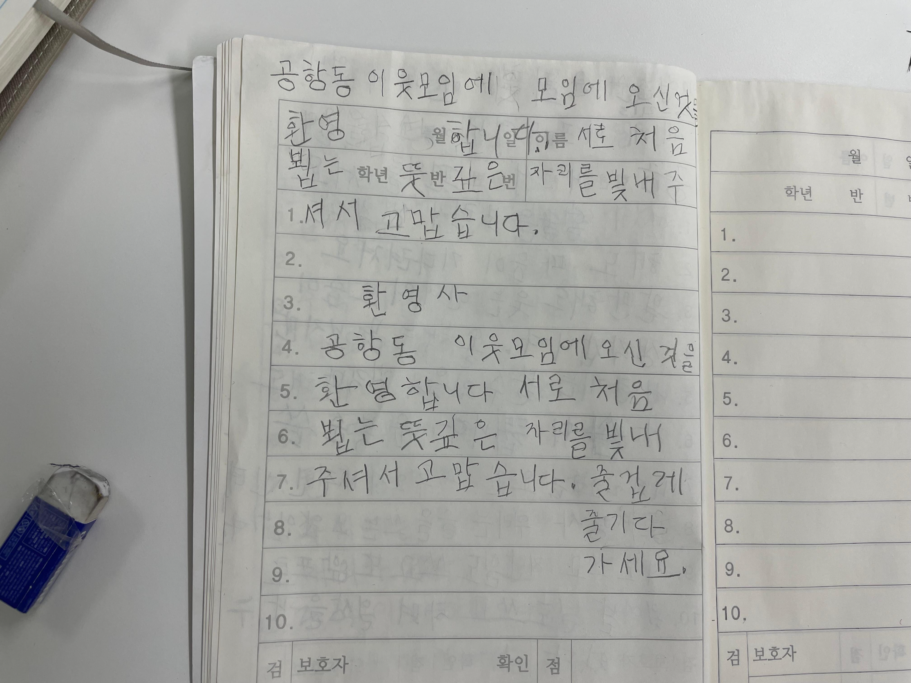 [신 선생님께서 채워주신 환영사 내용] 안녕하세요! 일상 글쓰기 모임에 참여하고 있는 신경숙입니다. 회원분들은 윤복순 님, 염춘순 님, 윤희철 님 모두 4분이 참여하고 계십니다. 공항동 주민분들께서도 글도 배우고 글쓰기에 관심 있으신 분들도 언제든 환영합니다. 일상 글쓰기 모임은 한 달에 3번, 1시간 반 동안 화요일에 다양한 주제로 글도 배우고 쓰면서 서로의 글을 발표하며 나누는 뜻깊은 즐거운 모임이죠. 시를 쓰거나 지난 추억들을 되짚어 보기도 하고 서로의 고충들을 나누기도 하며 위로 받고 기쁨을 얻기도 하지요. 그리고 앞으로의 희망, 바램들을 글로 써보며 일상을 나누기도 하며 어려운 맞춤법 공부도 하고, 가족·친지분께 편지를 써보기도 한답니다. 다양한 주제의 글감으로 글을 써보는 경험은 재미있고 보람이 많답니다. 이렇게 글로 모임 소개와 환영의 마음을 전하며 뜻깊은 자리를 빛내주신 여러분께 감사드리며, 공항동 이웃모임 공유회를 위해 여러모로 수고해 주신 여러 선생님들과 회원분들께 고개 숙여 깊이 감사드리며 더욱 발전되기를 기원합니다! |