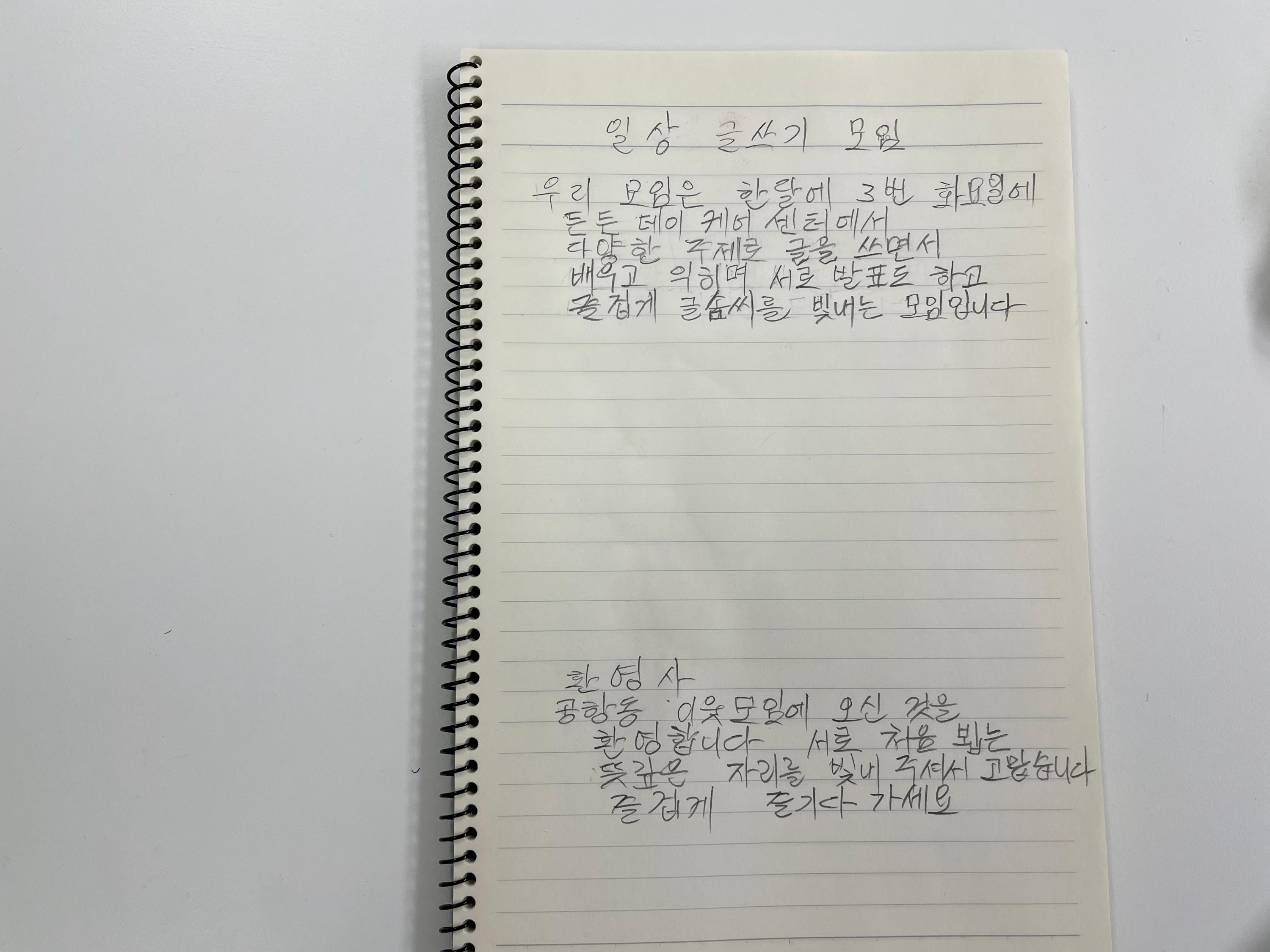 이 모임은 필사, 가족에게 편지 쓰기, 자연 묘사, 일기 작성 등 다양한 주제로 이야기 나누며, 자신의 생각과 감정을 자유롭게 글로 표현합니다.