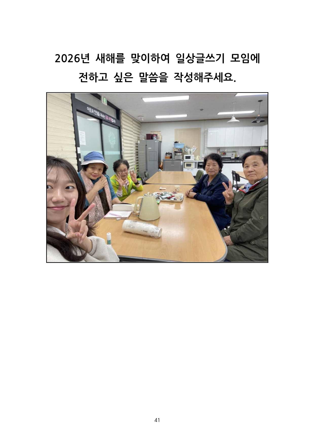 2025년에는 11월을 마지막으로 활동을 마무리합니다. 12월부터 눈이 내려 길이 미끄러워질 수 있어, 어르신들의 안전을 위해 한 달간 모임을 쉬기로 하였습니다. 윤 씨 어르신께서 “선생님, 모임 안 나오는 동안 숙제 주셔야 해요”라고 말씀하셨습니다.