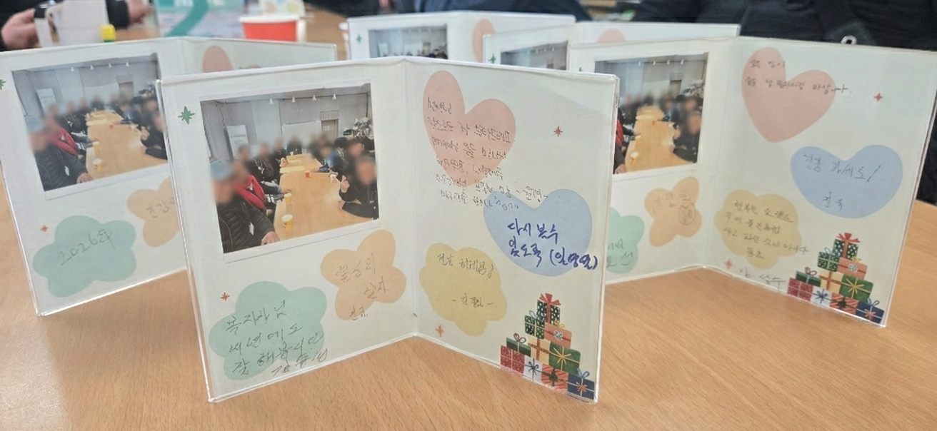 지금의 따뜻한 순간을 기억하고 새해 덕담을 나누며, 새롭게 시작하는 2026년의 소망과 기대하는 마음을 롤링페이퍼에 적어 나누자고 제안했습니다. 롤링페이퍼를 어떻게 적는지 간단하게 설명했지만 처음 써보는 탓에 우스운 광경이 벌어지기도 했습니다. 김 선생님은 센스있게 음악을 틀어달라며 BGM을 요청하셨습니다. 잔잔한 음악을 들으며 서로 전하고 싶은 말을 적어내려가셨습니다.