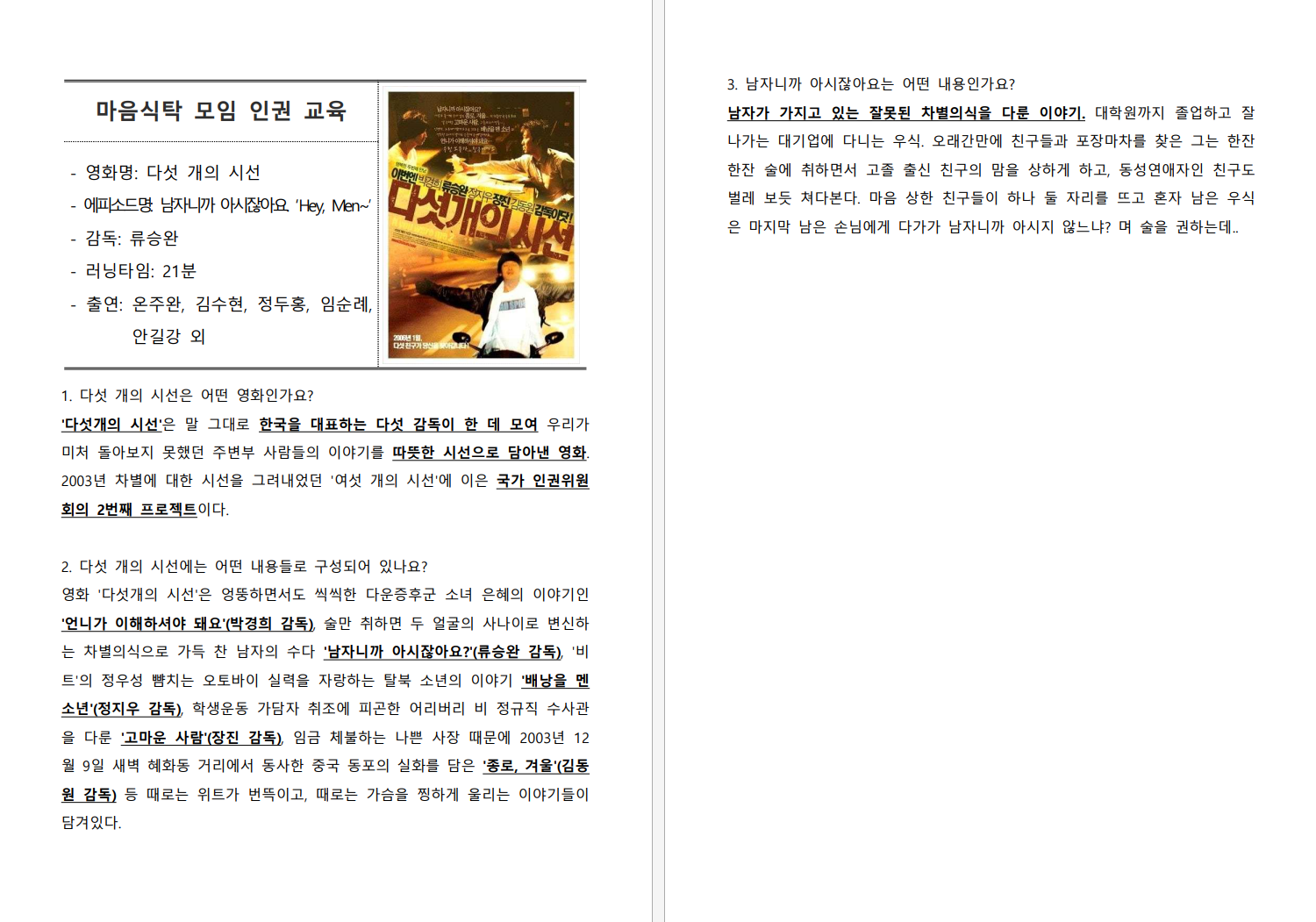 2025년 한 해 동안 중장년 남성분들과 함께 처음으로 인권교육을 진행하게 되어, 어떤 주제가 참여자분들의 인권을 지키는 데 도움이 될지 찾아봤습니다. '남자'를 주제로 한 인권영화가 많지 않았습니다. 그러던 중 국가인권위원회에서 제작한 「다섯 개의 시선」 의 류승완 감독의 "남자니까 아시잖아요?"라는 인권영화를 함께보면 좋을 것 같았습니다.