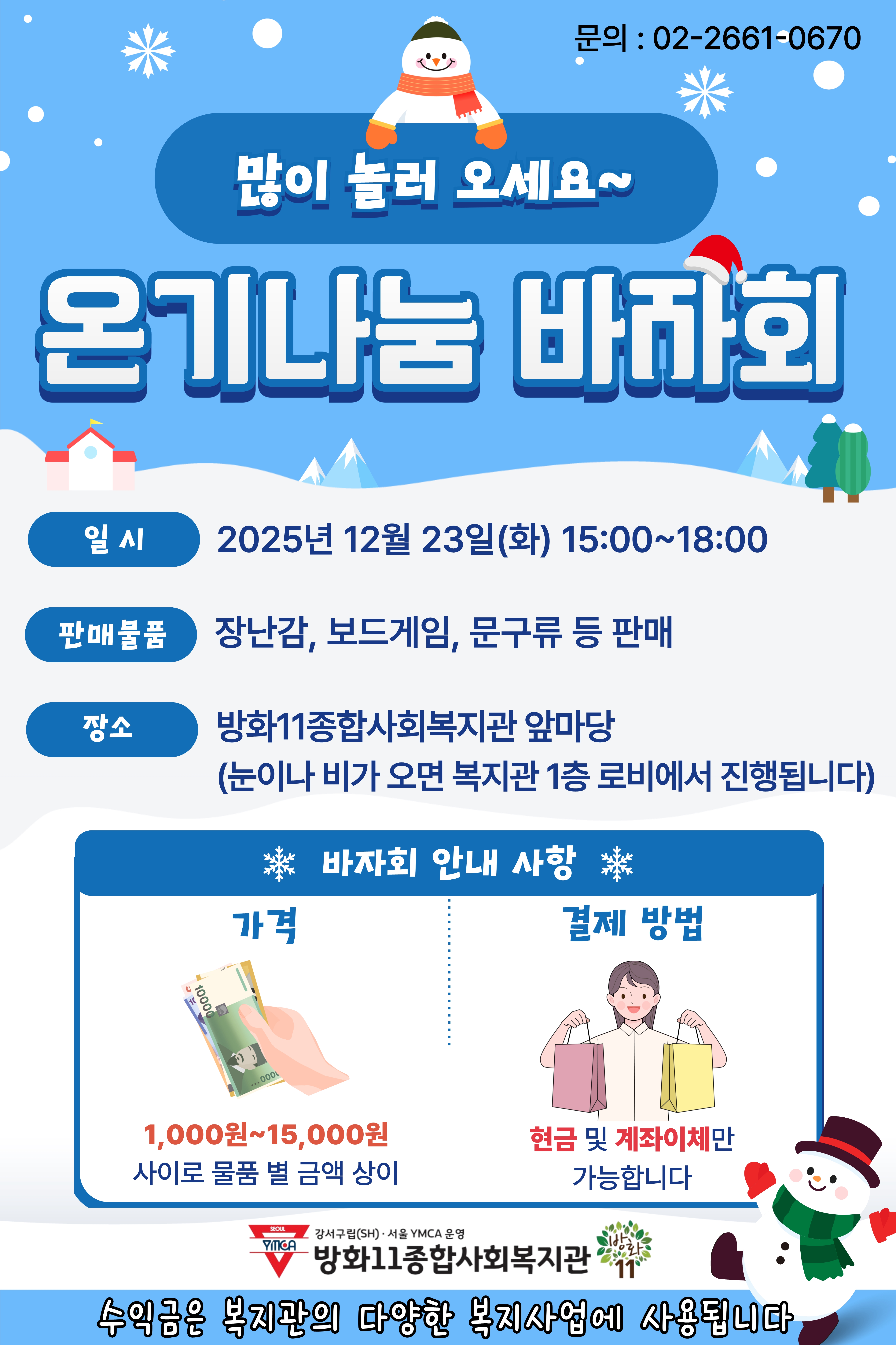 - 장소 : 방화11종합사회복지관 앞마당(눈이나 비가 오면 복지관 1층 로비에서 진행)