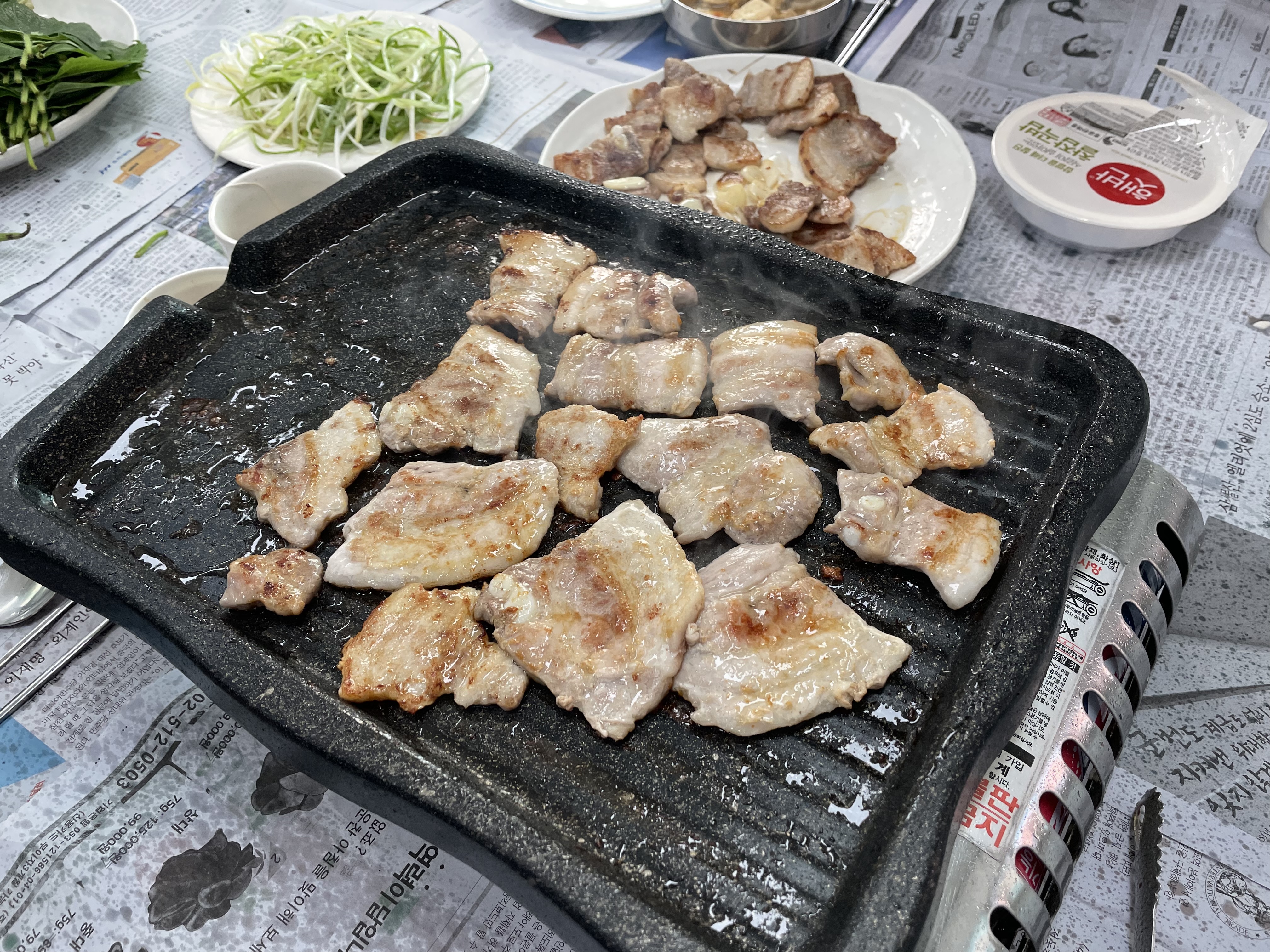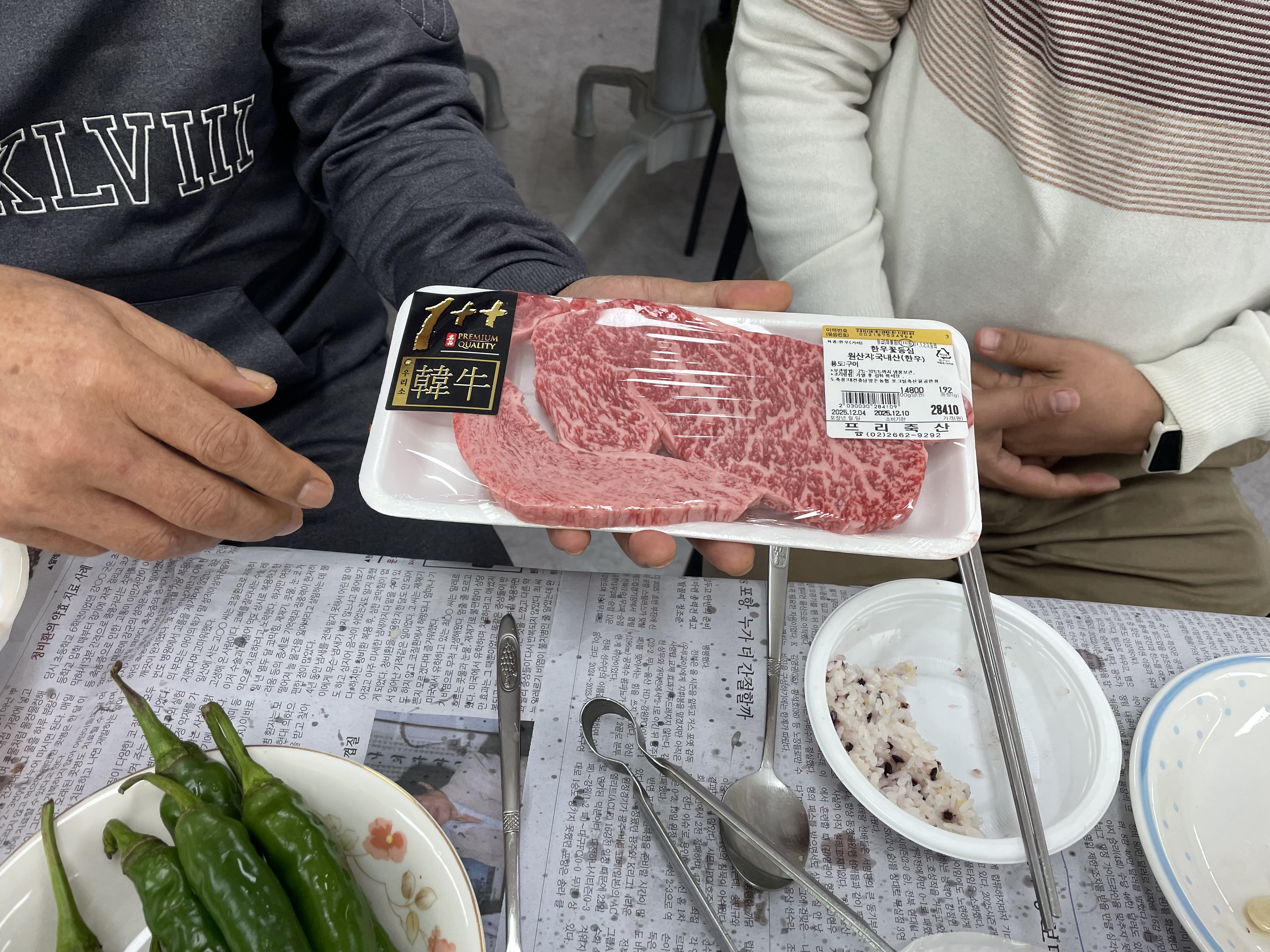 정 선생님은 “이렇게 모였으니 제가 대접하고 싶어요.”라고 말씀하시며, 사비로 한우를 구매해 주셨습니다. 모임을 위해 자신의 것을 기꺼이 내어놓는 모습에서 따뜻한 마음이 느껴졌습니다. 처음 참여한 천 선생님 또한 마늘, 고추, 햇반 등을 넉넉히 준비해 오며 모임에 적극적으로 함께하였습니다. 허 선생님께서는 고기불판을 가져와 주시며 준비 과정에 힘을 보태주셨습니다.