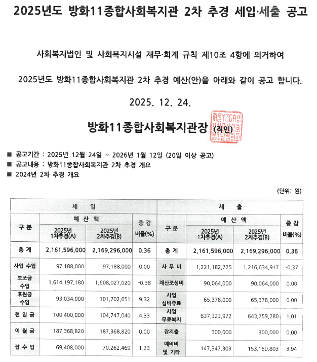 방화11종합사회복지관 2025년 2차 추경예산 공고