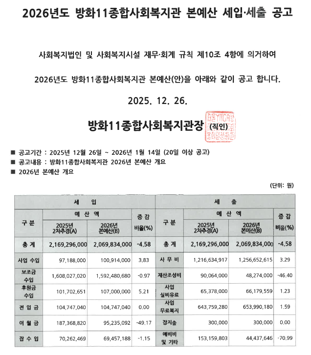 | 방화11종합사회복지관 2025년 2차 추경예산 공고 (0) | 2025.12.22 |