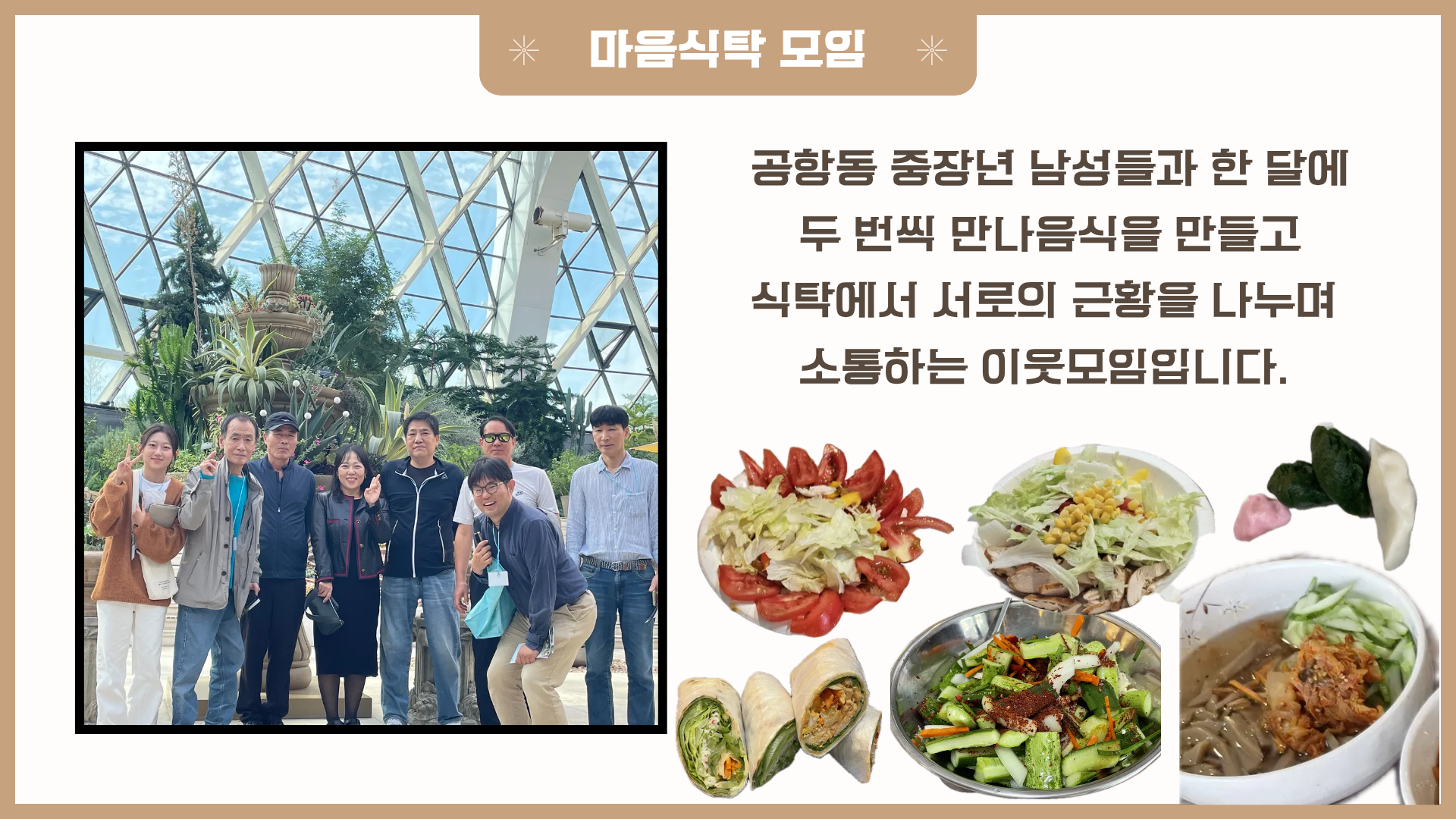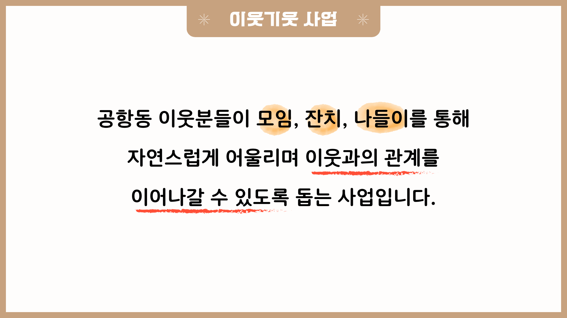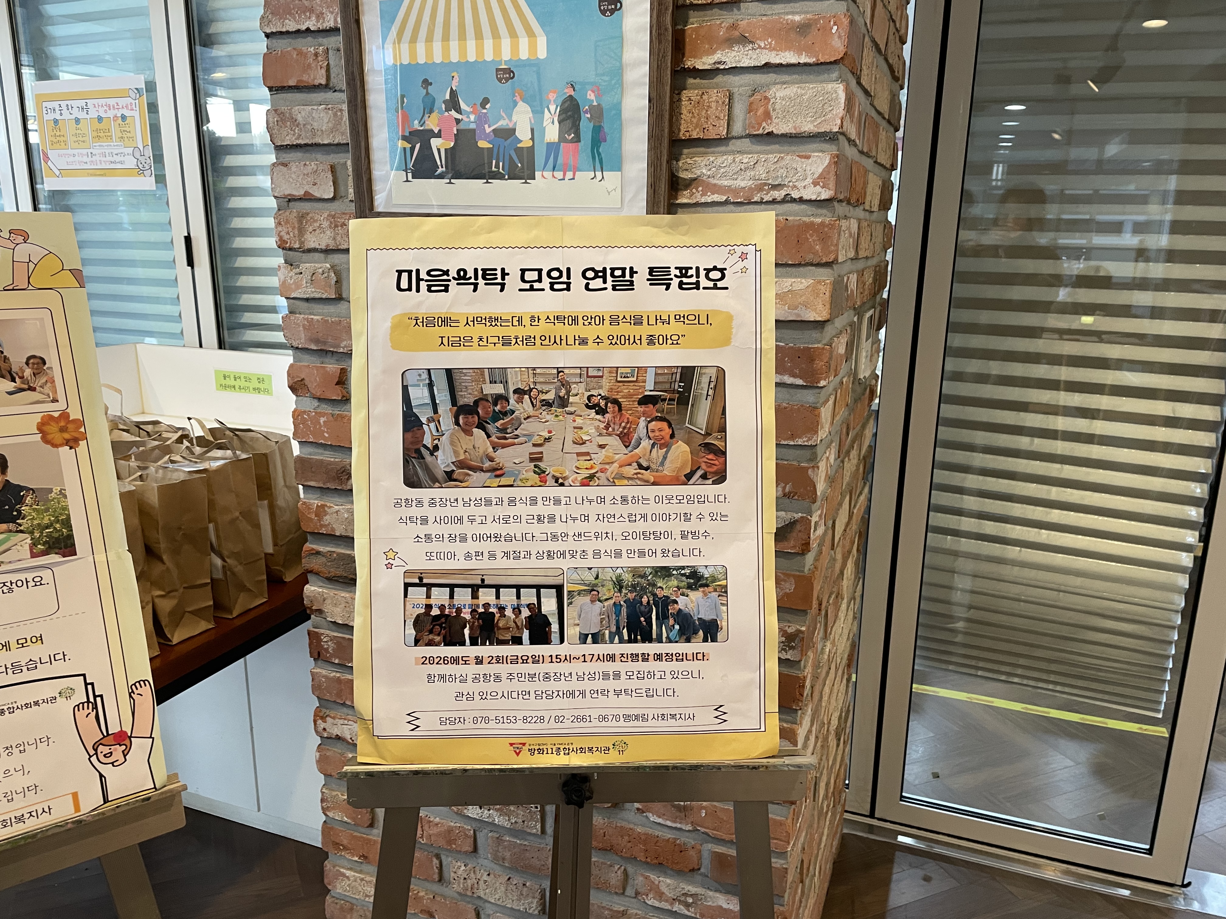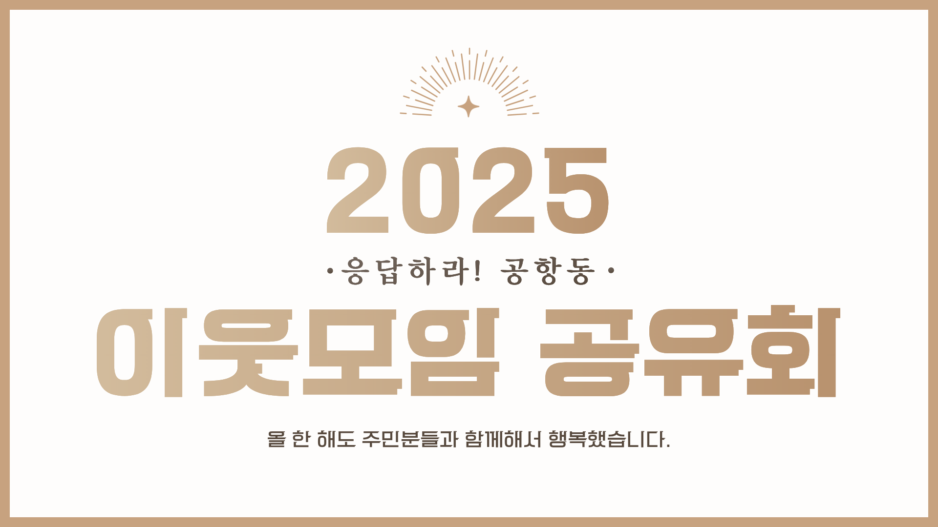 2025년의 연말을 맞아 공항동 이웃모임에 참여해 주신 주민분들과 인사나누는 시간을 가졌습니다. 한 해 동안 함께 웃고 이야기하며 쌓아온 시간들을 돌아보고, 감사의 마음을 전하고자 이번 자리를 준비하였습니다.