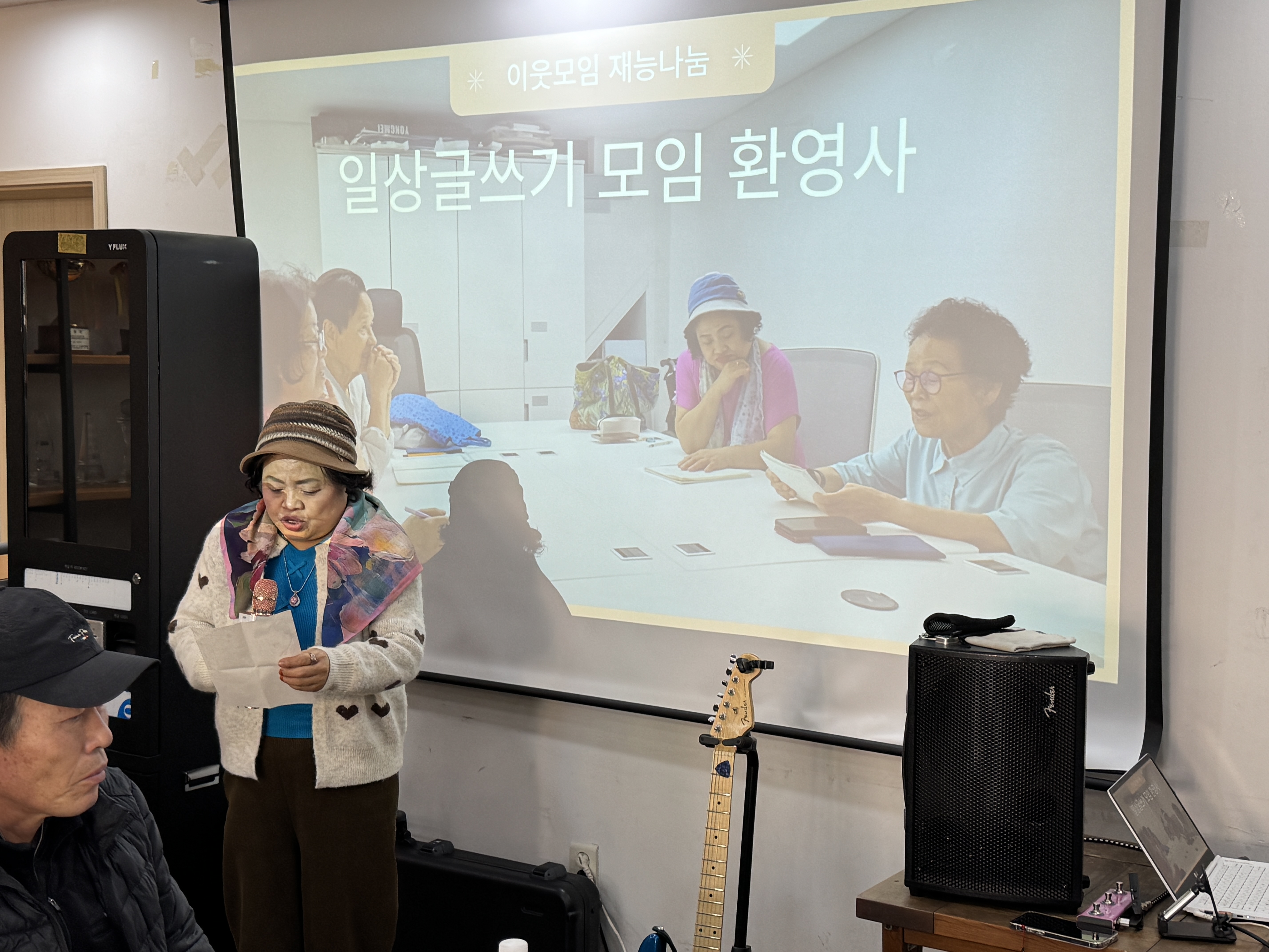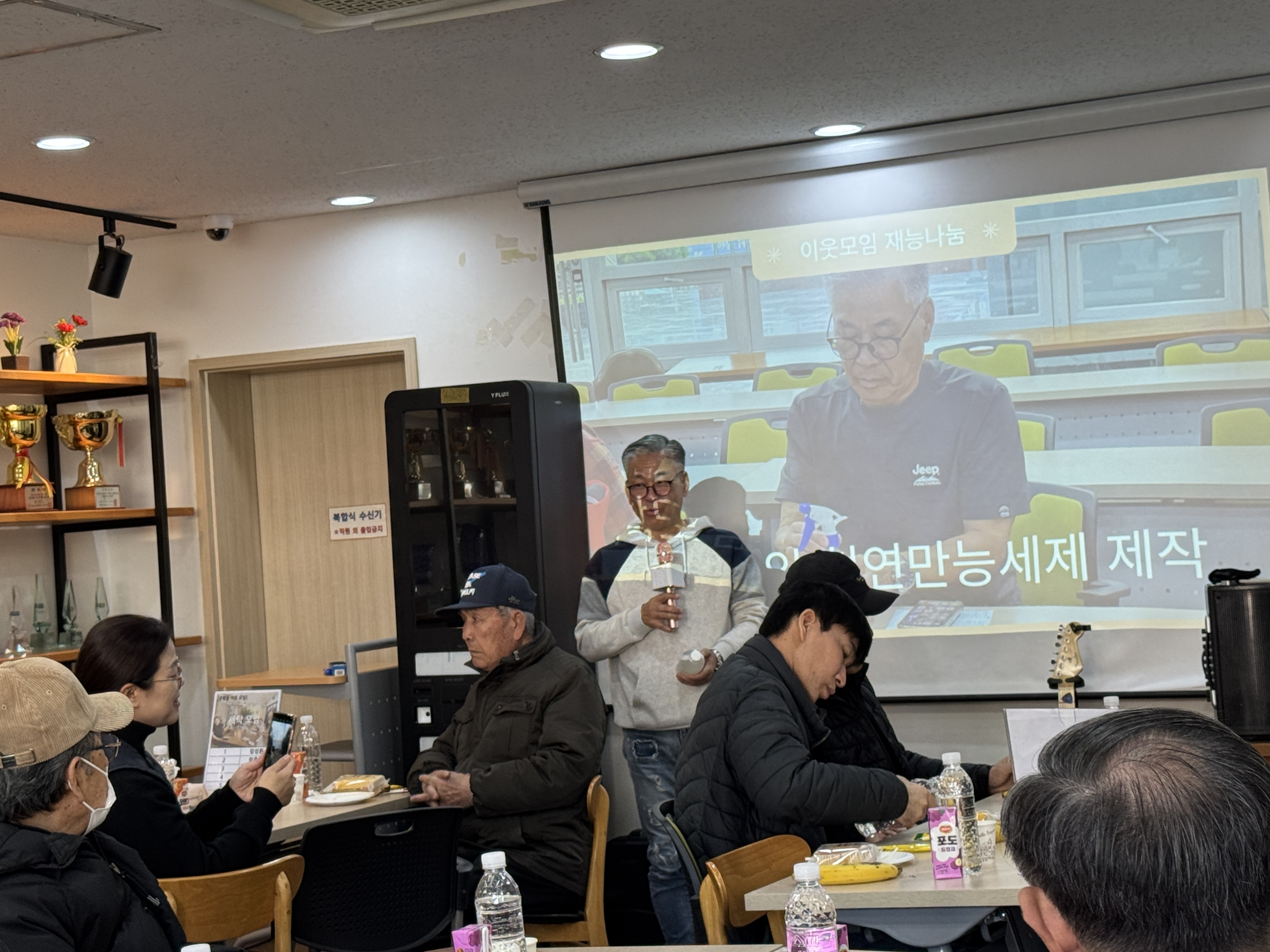 2025년 공유회의 핵심 포인트는 각 모임의 분위기와 특징을 느낄 수 있도록, 모임별로 대표자 한 분을 선정해 재능을 나누는 시간입니다. 일상글쓰기 모임에서는 한 해를 여는 환영사를 함께 나누며, 서로를 반갑게 맞이하고 마음을 여는 시간을 가졌습니다. 독서모임에서는 시를 낭송하며, 그동안 함께했던 일들을 이야기해주셨습니다. 세탁모임에서는 일상에서 바로 활용할 수 있는 천연 세제를 나눠드리고 소개했습니다. 마음식탁 모임에서는 기타 연주로 연말의 느낌을 더했습니다. 각 모임마다 서로 다른 방식으로 소통하며, 활동의 의미와 즐거움을 주민분들과 함께 나눴습니다. 이 시간을 계기로 이웃 간의 관계를 한층 더 가까워졌기를 바라봅니다.