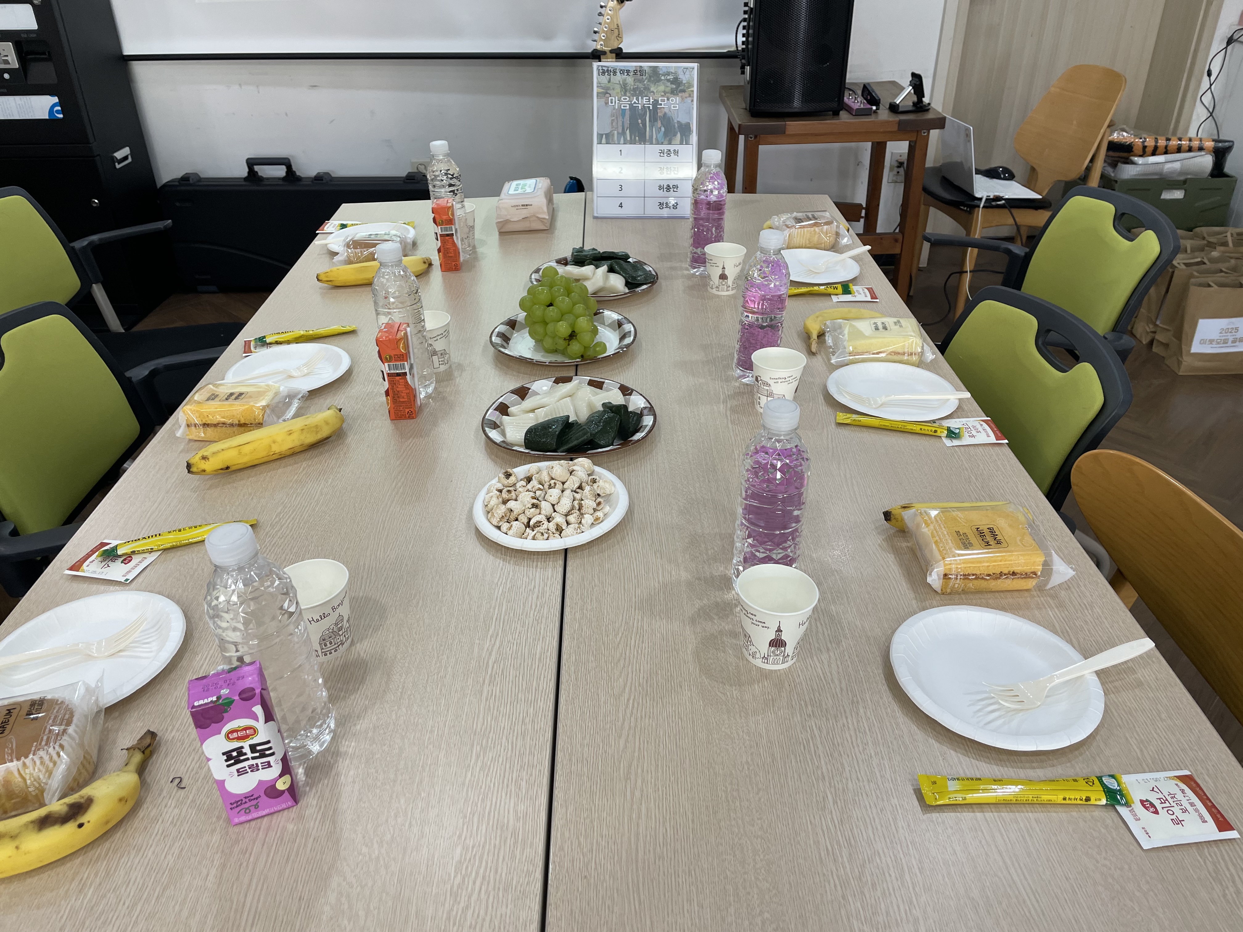 주민분들을 맞이하기 위해 이런저런 준비를 마쳤습니다. 중장년 마음식탁 모임 공유회에서 어떤 음식을 나누어 먹으면 좋을지 여쭤보았을 때 과일, 케이크 등의 의견이 나왔습니다. 참여 인원이 많아 준비 방법을 고민하던 중, 케이크처럼 부드러운 카스테라 빵과 과일, 떡, 물, 음료, 커피 등을 준비했습니다. 준비를 모두 마치고 나니, 그동안 생각으로만 하던 공유회가 한층 더 실감 나게 느껴졌습니다.