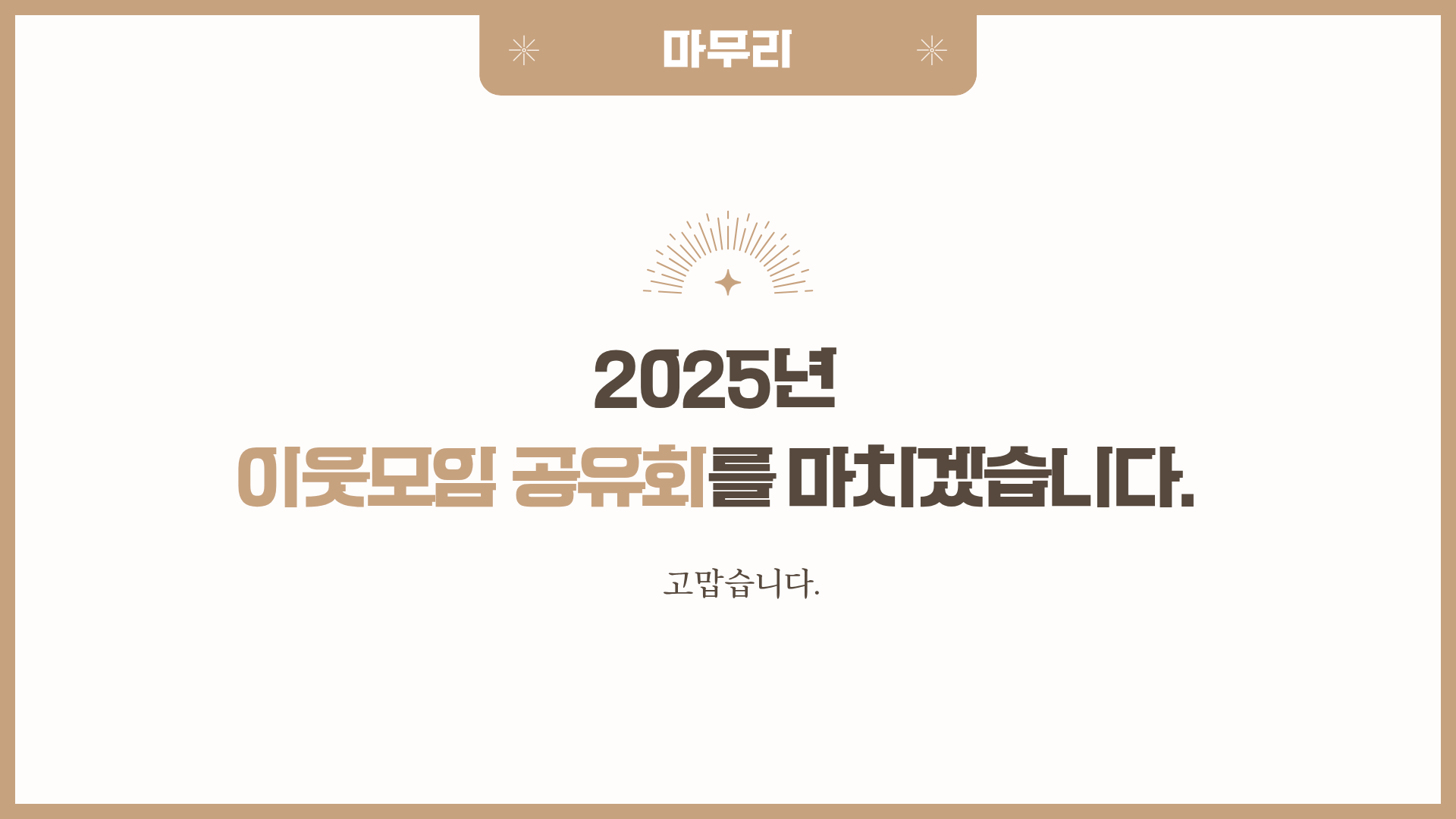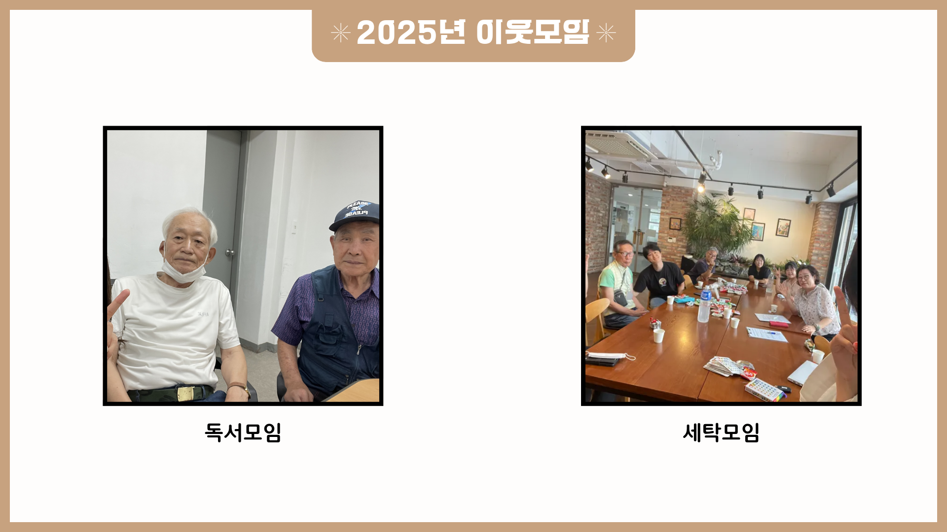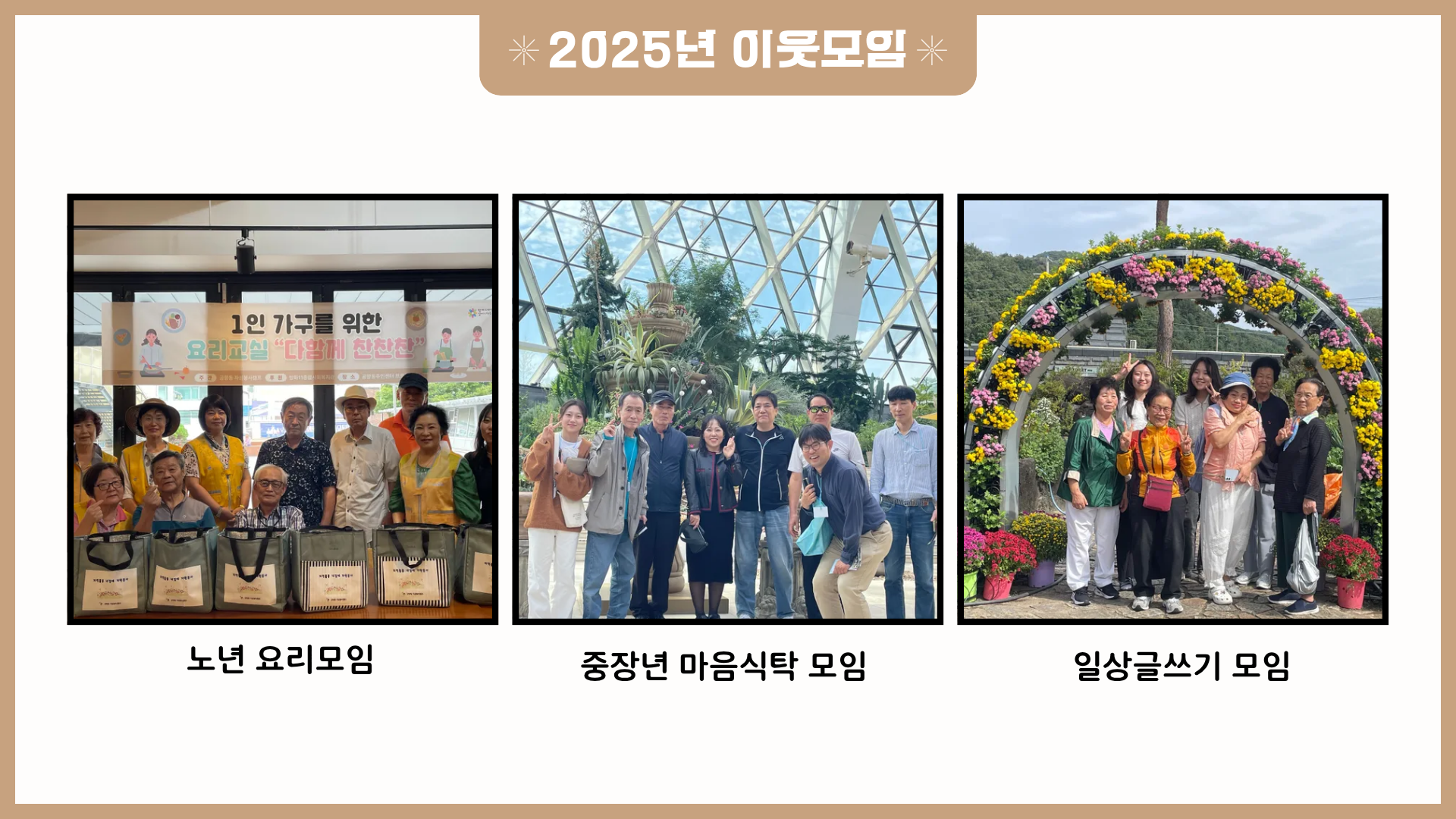 안녕하세요. 공항동 이웃모임을 담당하고 있는 사회복지사 맹예림입니다. 2025년 한 해 동안 주민분들과 함께한 소중한 순간들을 담아, 추억으로 간직하실 수 있도록 액자를 제작했습니다. 주민분들과 이런저런 이야기를 나누며 함께 웃을 수 있어 진심으로 행복했습니다. 오늘 우리가 함께했기에, 공항동은 어제보다 조금 더 살기 좋은 동네가 되어가고 있다고 생각합니다. 올 한 해를 바탕으로, 2026년에는 더욱 즐겁고 재미있는 이웃모임을 만들어 갈 수 있도록 열심히 거들겠습니다. 감사합니다.