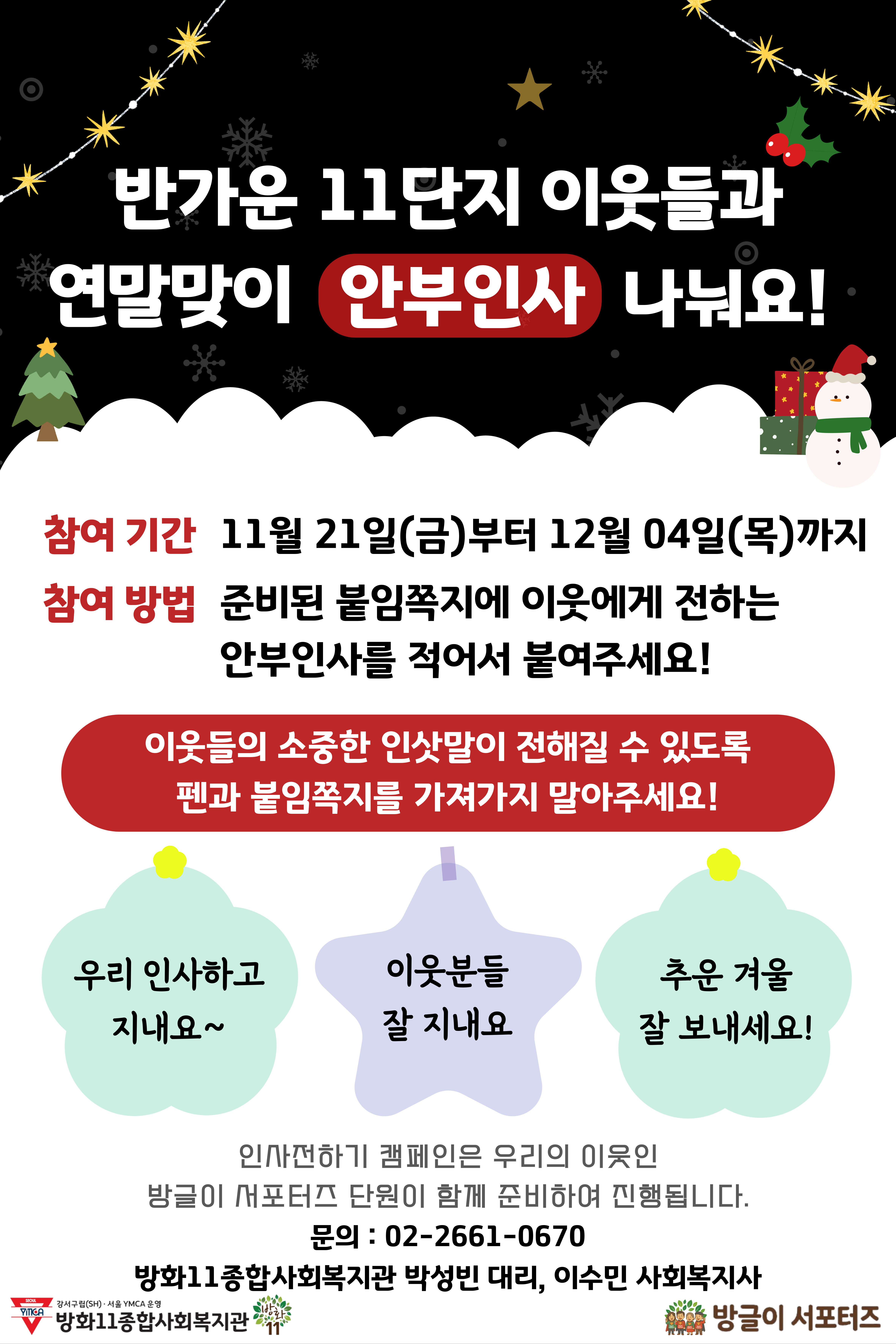 연말을 준비하며 방화11단지에서 이웃과 함께 따뜻한 안부 인사를 나누는 동 별 안부전하기 활동을 진행했습니다.
