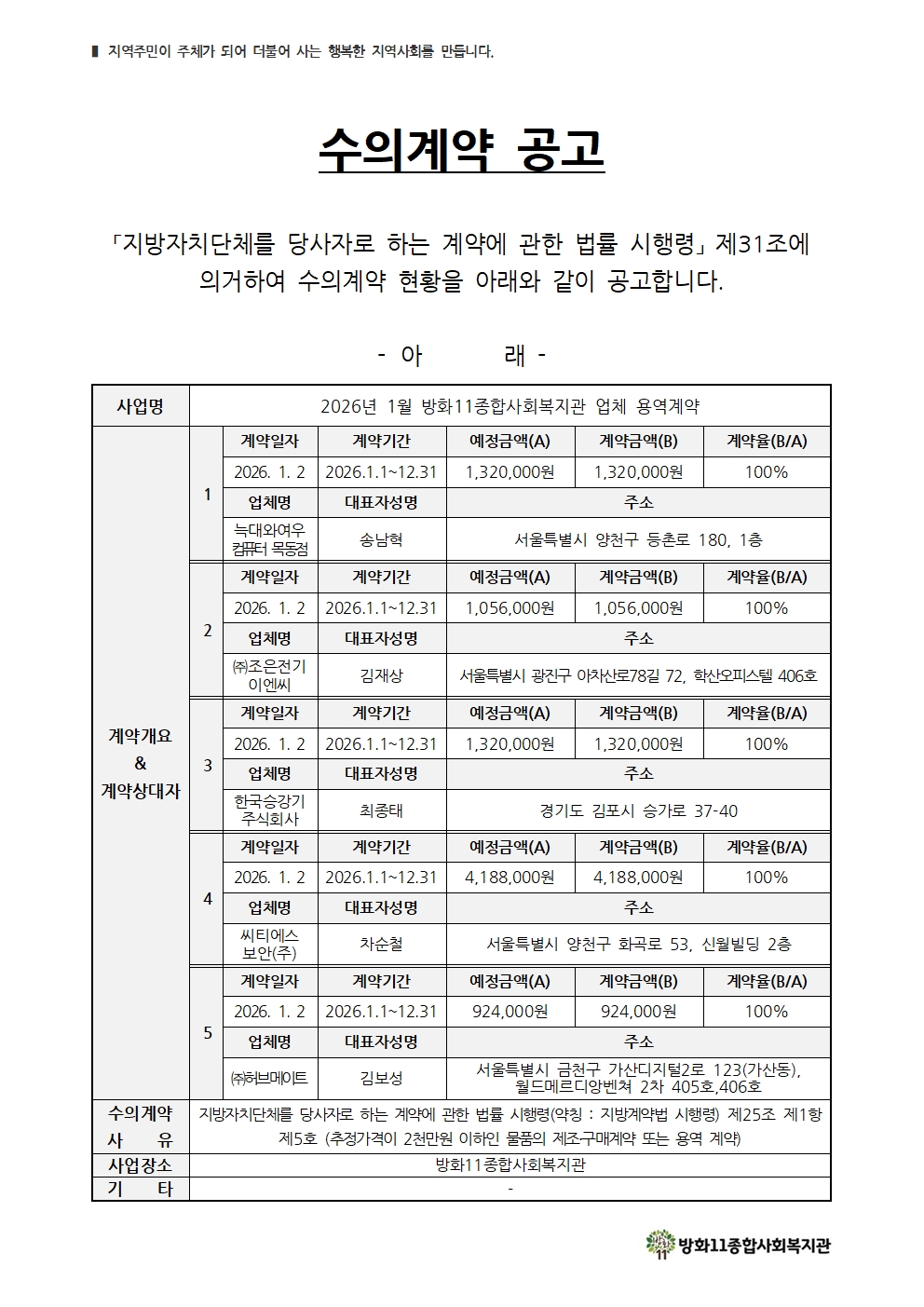 2026년 1월 업체 용역계약 수의계약 공고