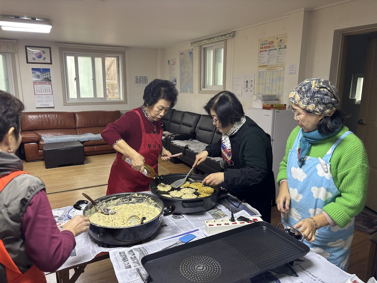 잔치 당일, 오전 10시쯤 경로당에 도착하니 이미 마을 주민들께서 잔치 음식을 만들기 위해 모여 계셨습니다. 한쪽에서는 녹두 부침개를 부치고, 다른 한쪽에서는 잡채를 만들었습니다. 또 다른 한편에서는 봄동 겉절이를 무치고 떡국을 끓이며 각자 역할을 나누어 분주하게 움직이셨습니다. 각자 역할을 정해 척척 준비하시는 모습을 보니 잔치를 함께 만들어간다는 느낌이 더욱 들었습니다.