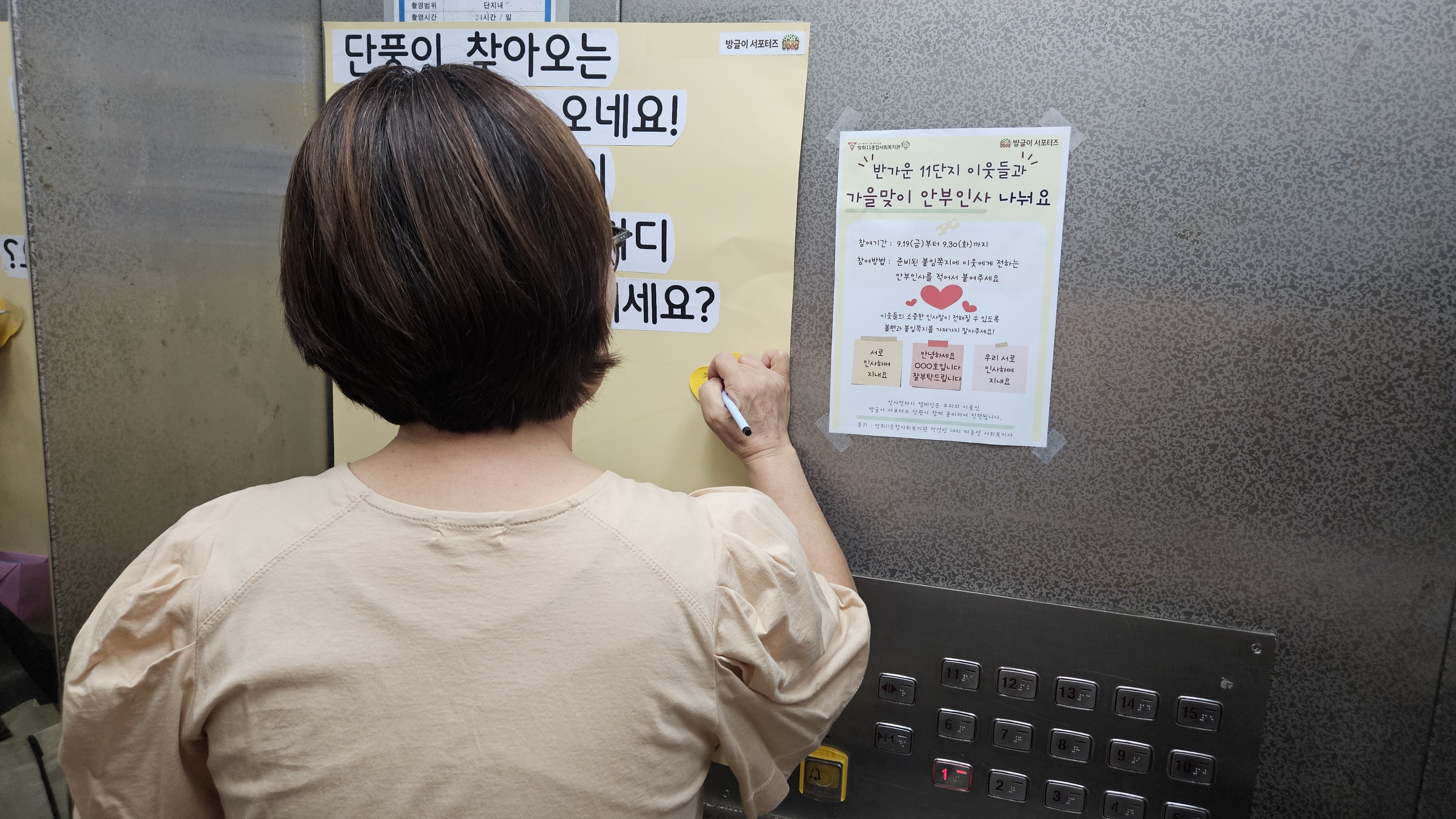 “11단지 주민분들이 서로 인사전하고 어울리며 지내길 바라는 마음에서 붙이는 거예요.”