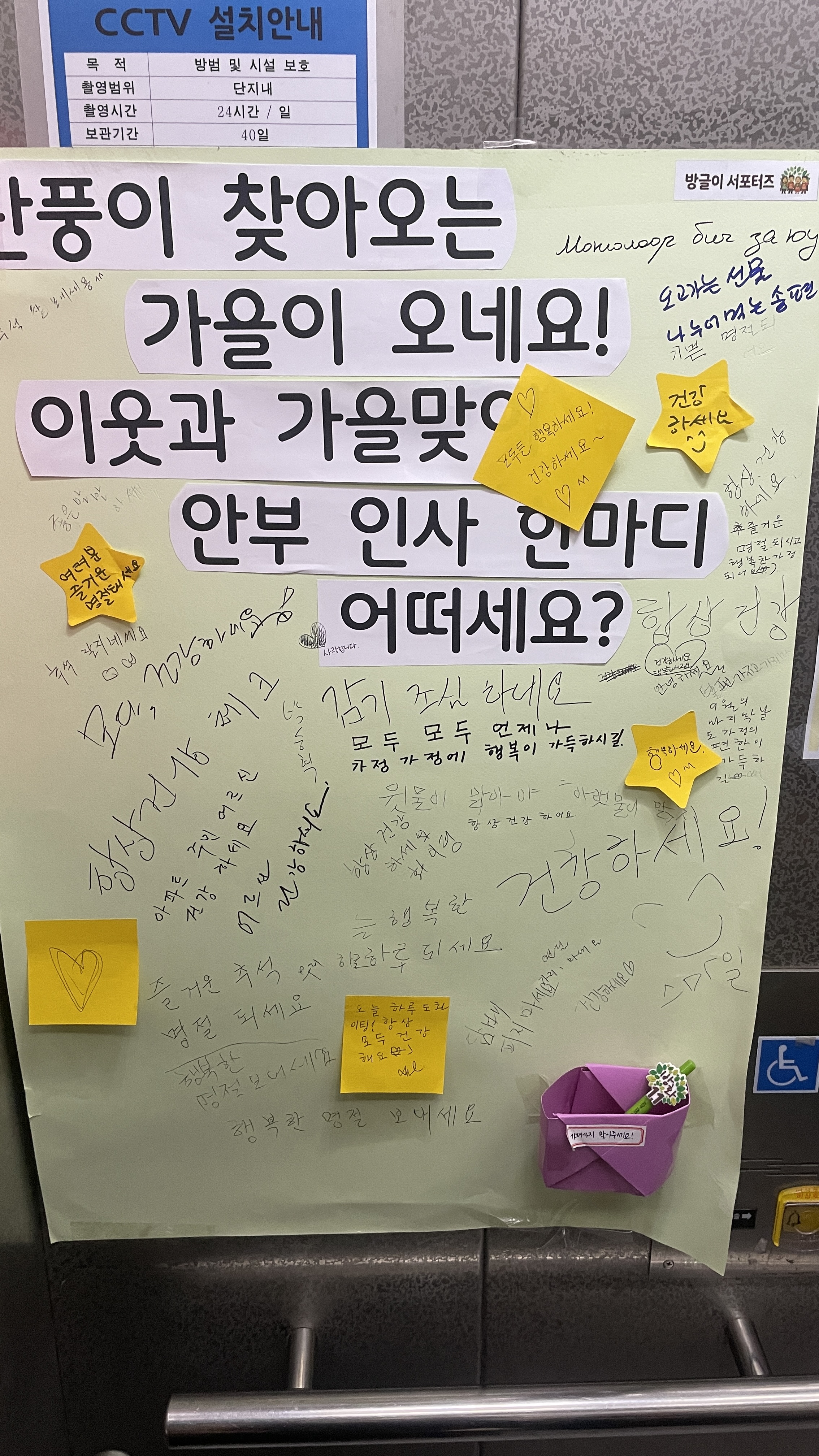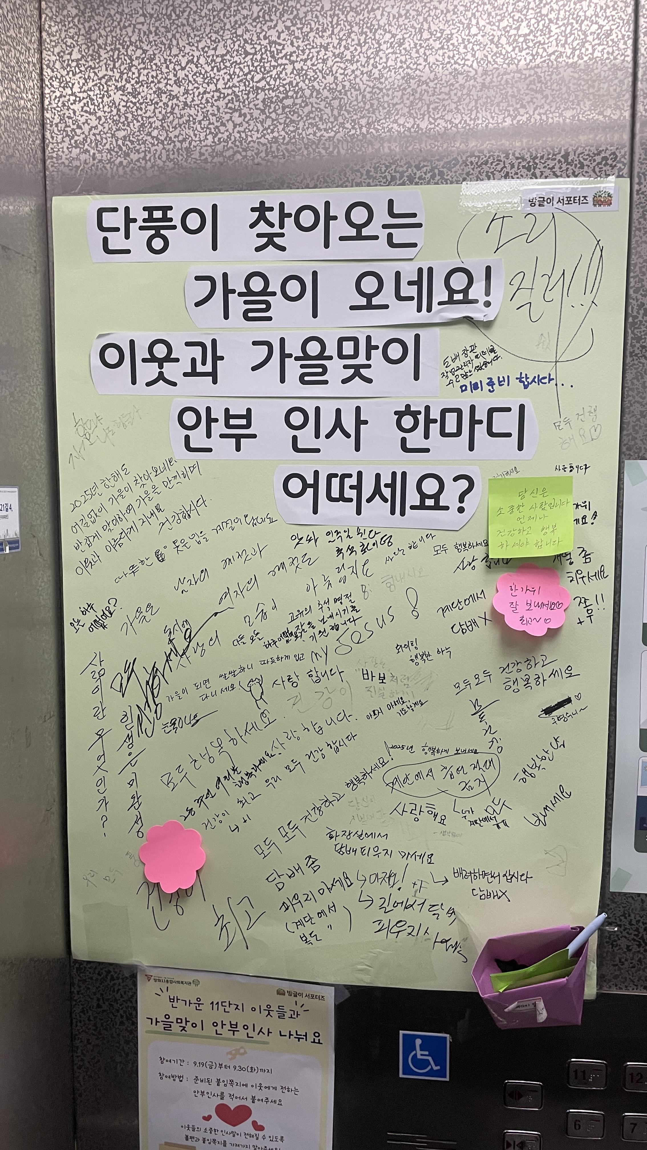 방글이 활동으로 붙임쪽지판을 붙여서 방화11단지가 서로 인사하며 지내실 수 있도록 돕고 싶어요. 혹시 방울 님 방글이 서포터즈이시니 도와주실 수 있으세요?”