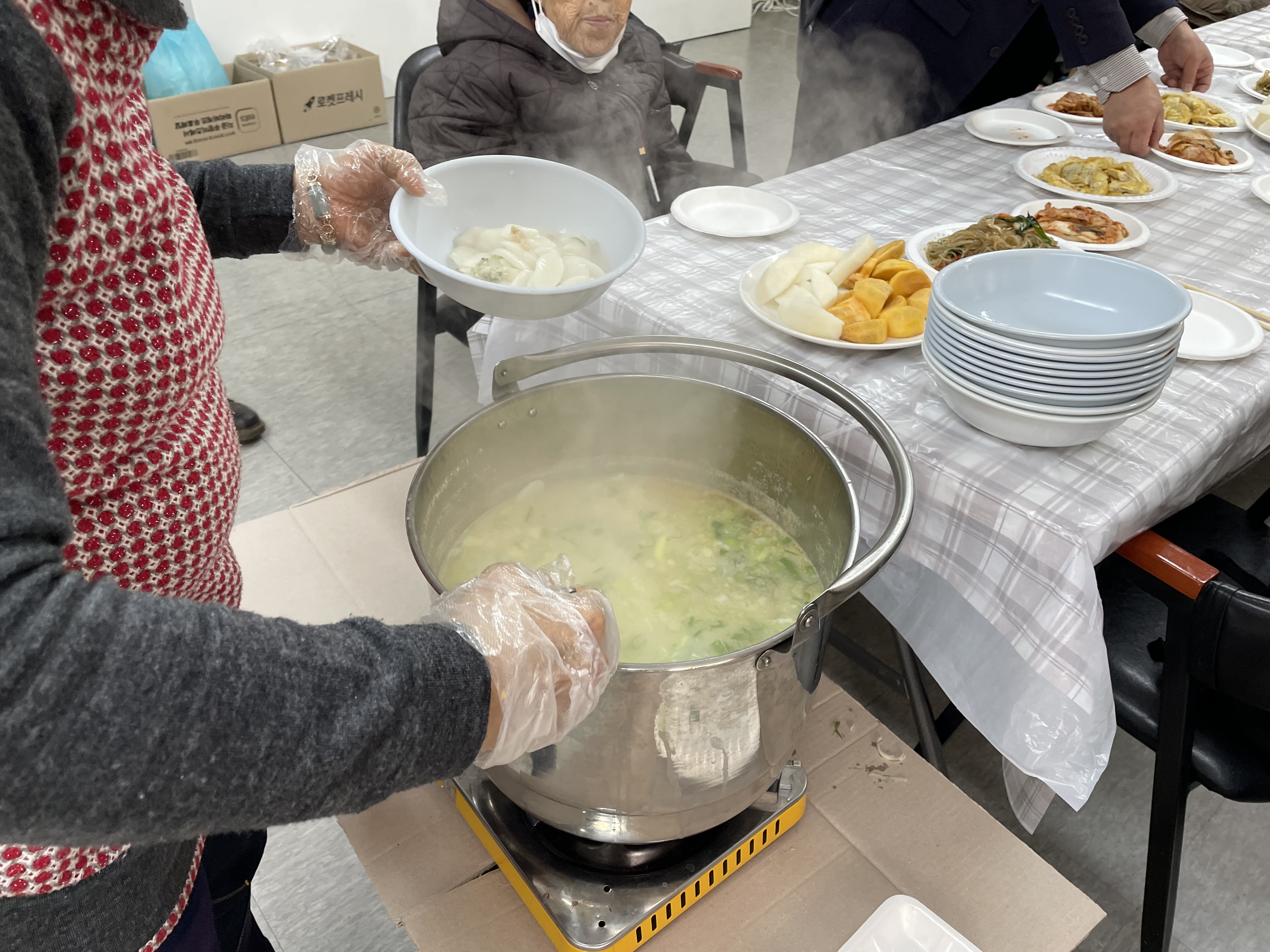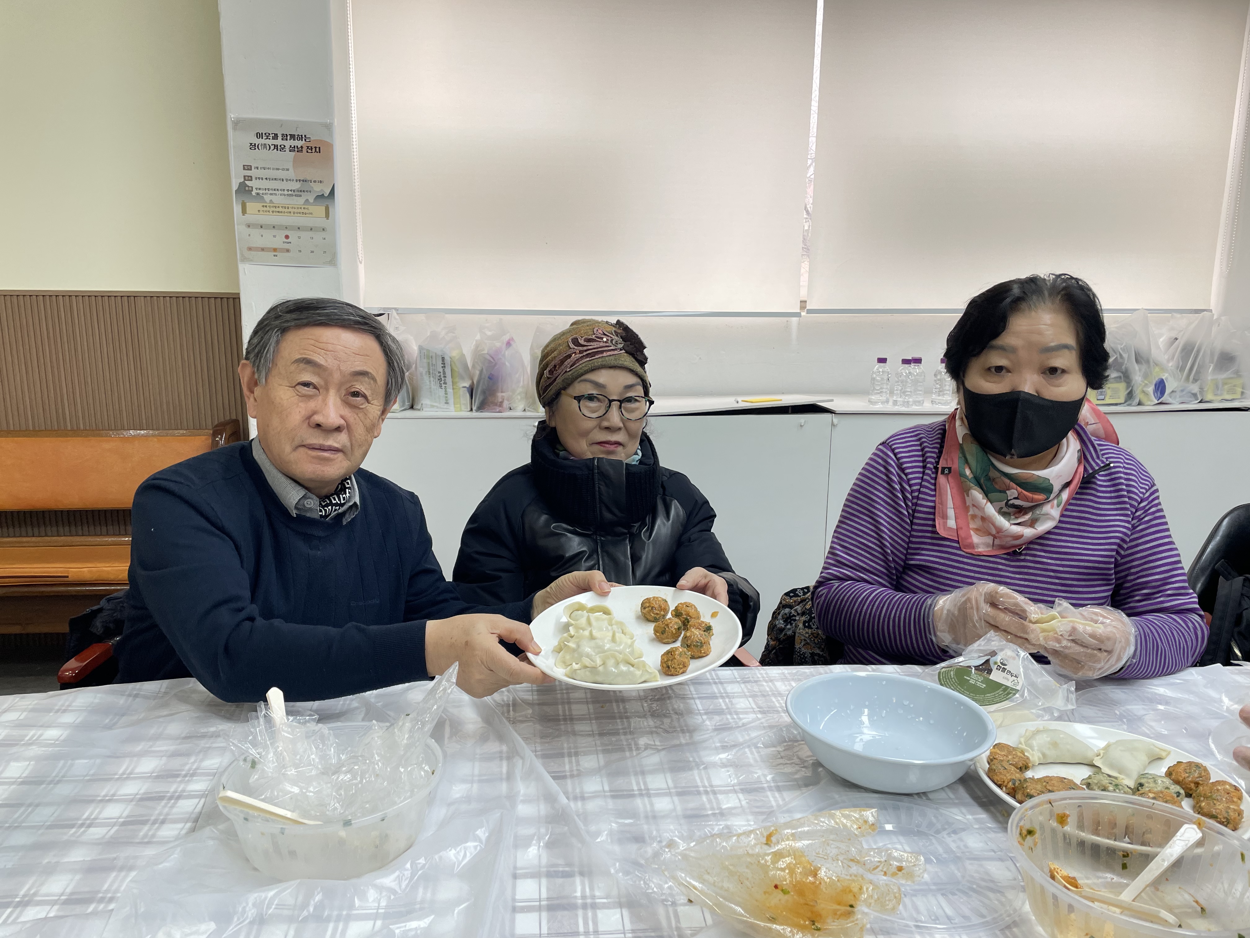 드디어 떡만둣국이 완성되었습니다! 주민들과 둘러앉아 동태전, 잡채, 김치, 감, 배 등을 나누어 먹었습니다. 직접 만들어서 그런지 떡만둣국이 더욱 맛있게 느껴졌습니다. 양도 넉넉하여 모두 배불리 먹을 수 있는 잔치였습니다.