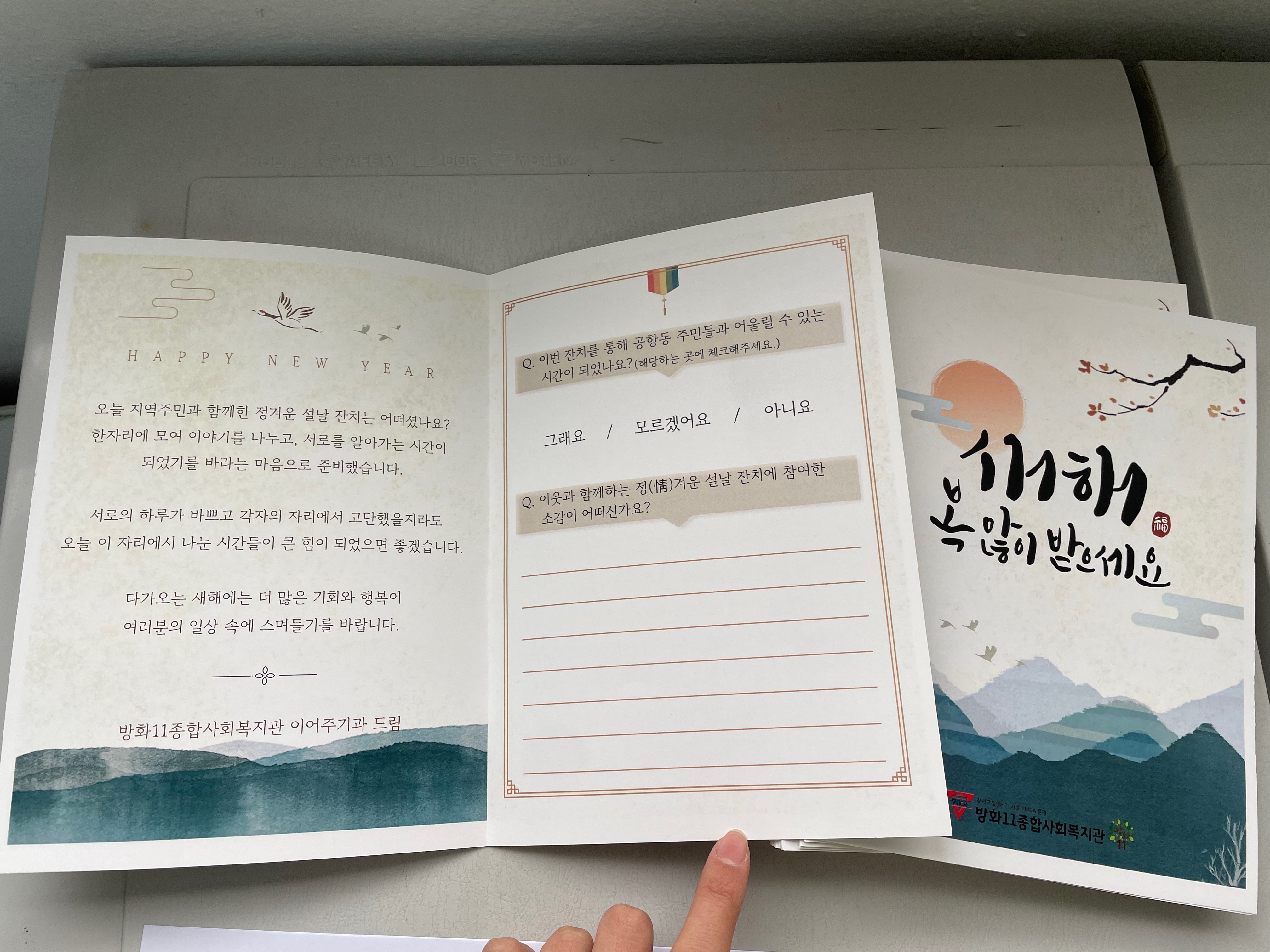 주민들은 이번 잔치를 어떻게 느끼셨는지 궁금하여, 간단하게 설문조사를 진행하였습니다. 설문조사만 하는 것보다, 제가 주민분들께 전하고 싶은 말씀도 간략히 적어, 담당자로서 공항동 주민분들의 안녕을 기원하였습니다.