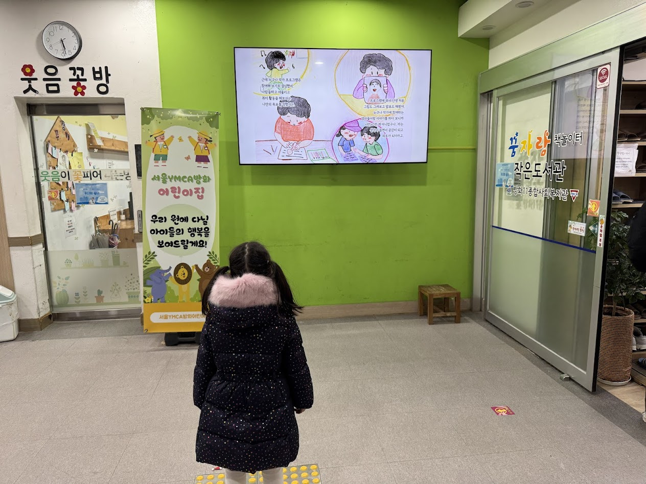 쉼터 전시회뿐만 아니라 어르신 작가님들의 동화책을 영상으로 제작하여 복지관 본관 로비에 상영하기도 했습니다.