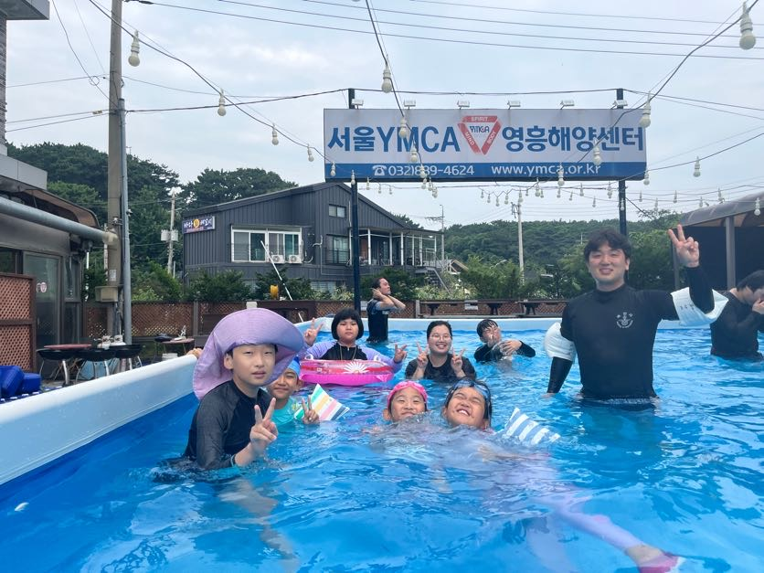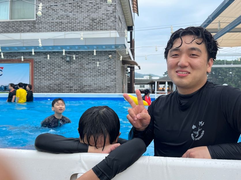 이후 수영장에서 물놀이를 하며 친해지는 시간을 가졌습니다.