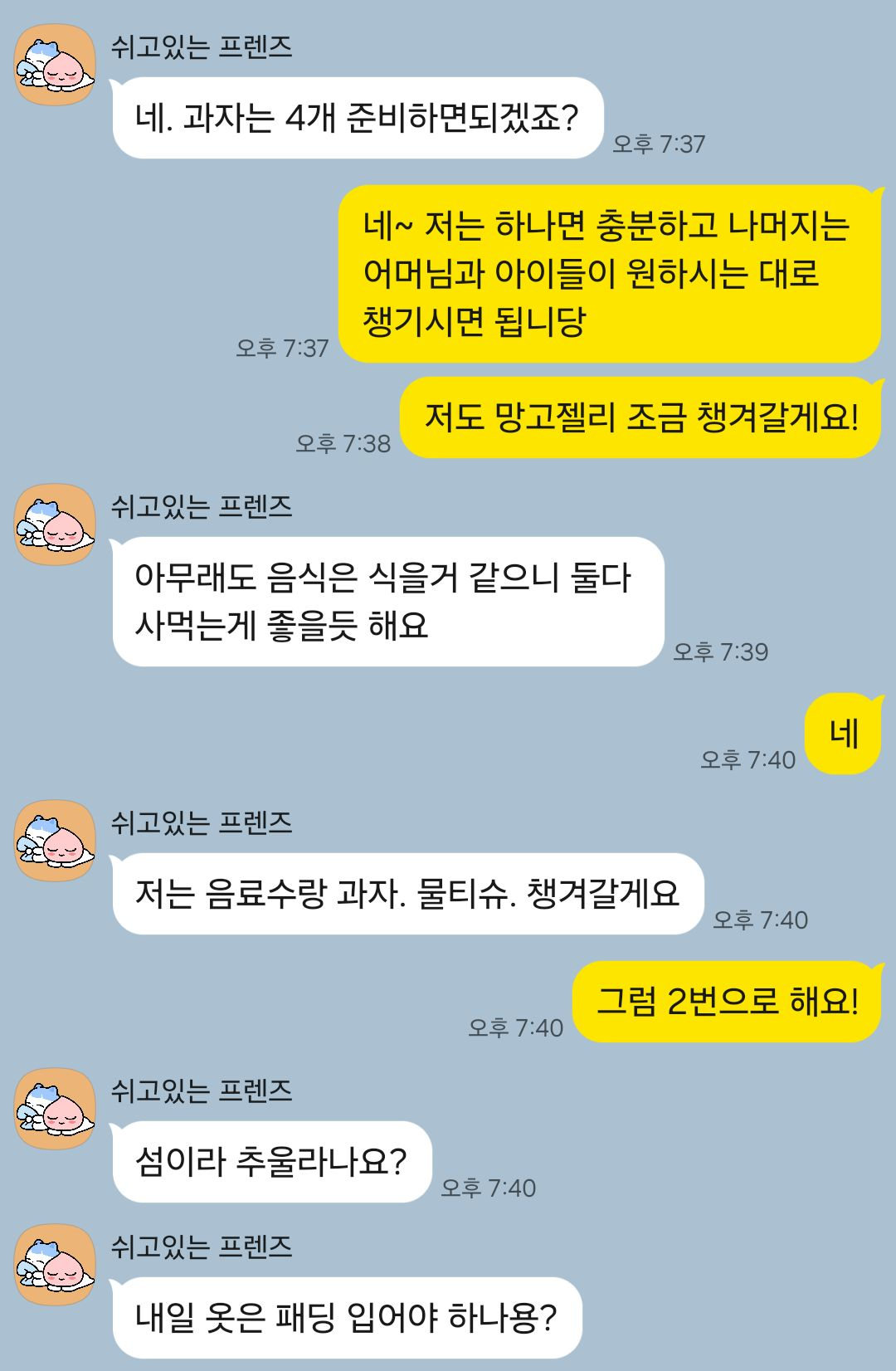 단체 채팅방을 개설해서 여행 전날까지 수시로 의견을 나누었습니다.